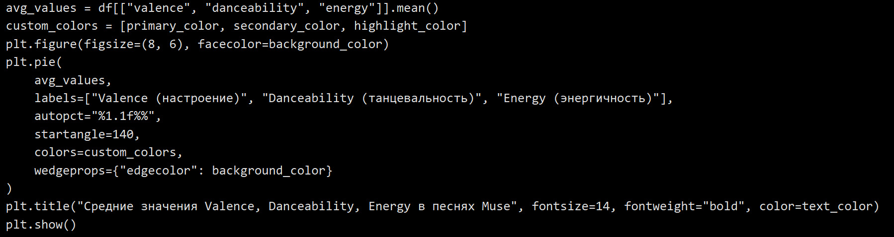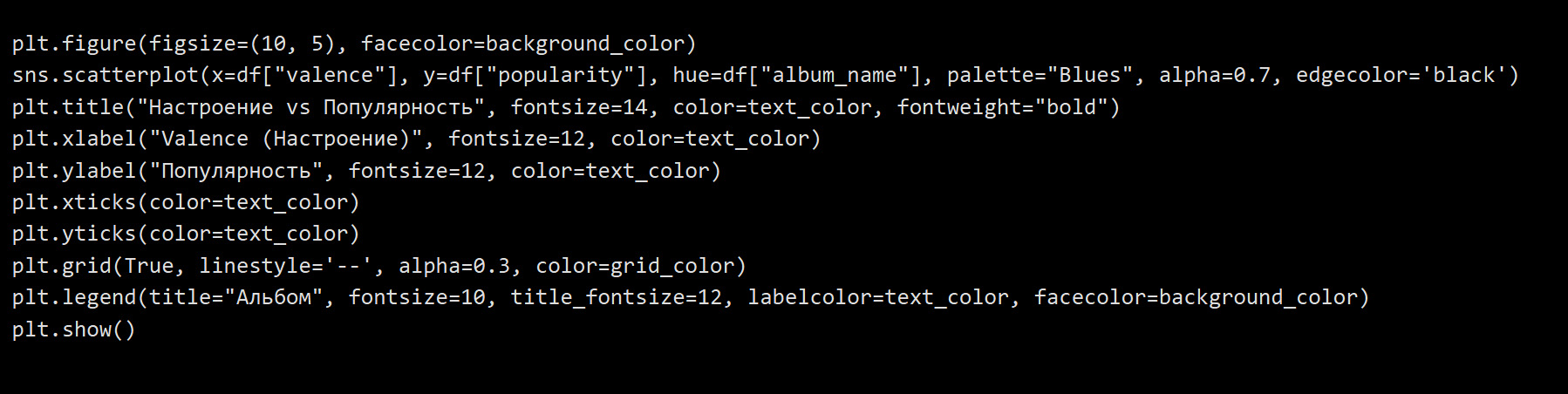 Типы графиков: 1. столбчатая диаграмма популярности альбомов 2. диаграмма рассеяния настроения и популярности 3. столбчатая диаграмма значений BPM 4. круговая диаграмма средних значений valence, danceability и energy