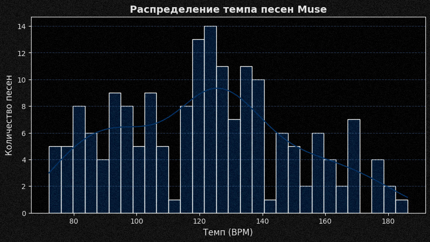Muse — одна из моих самых любимых и значимых групп в жизни. Они известны своим новаторским подходом к звуку и глубокими концептуальными альбомами. Их музыка отличается насыщенной динамикой и широкой палитрой звучания, включая как мягкие, эмоциональные моменты, так и эпичные, мощные композиции. Анализируя их альбомы, я стремлюсь к пониманию того, как разнообразие музыкальных характеристик влияет на восприятие их творчества слушателями.