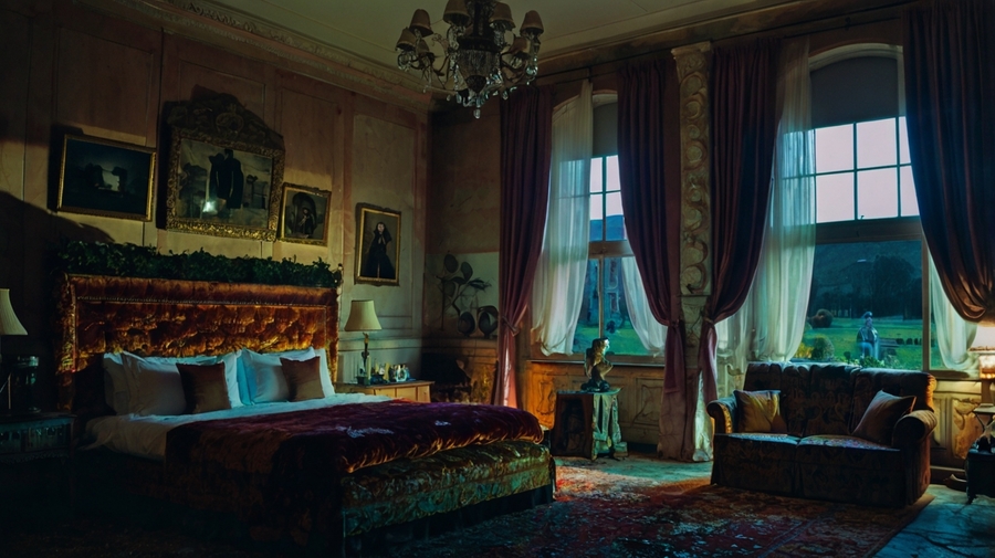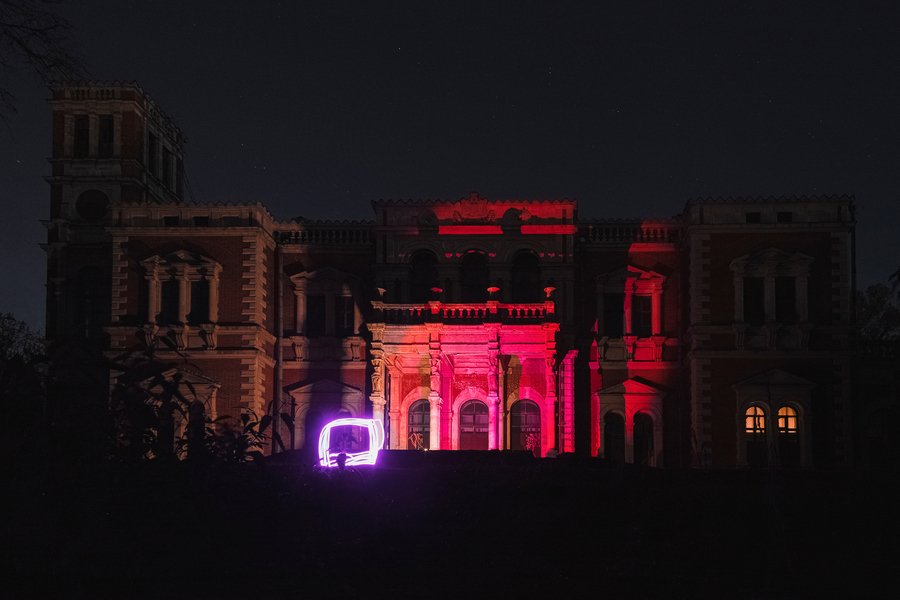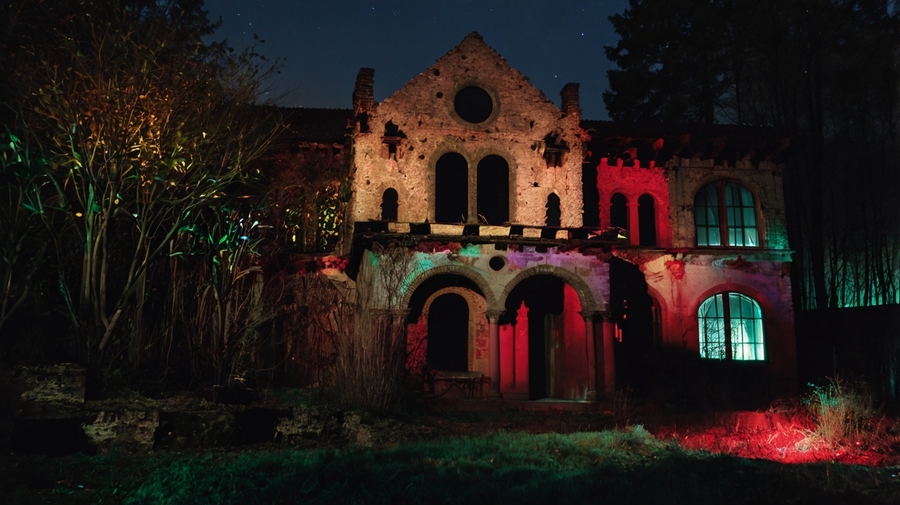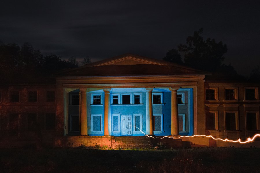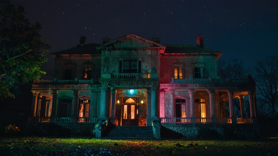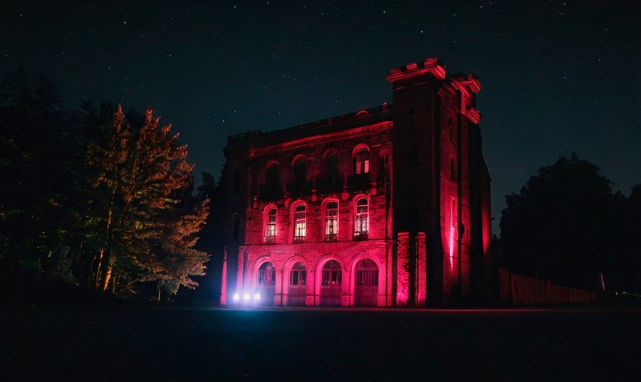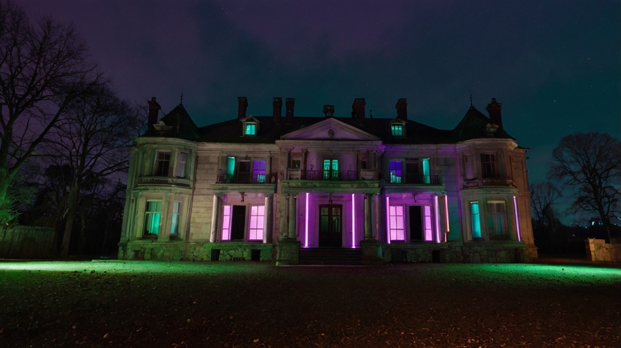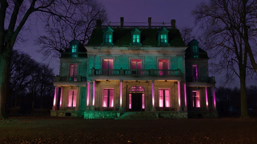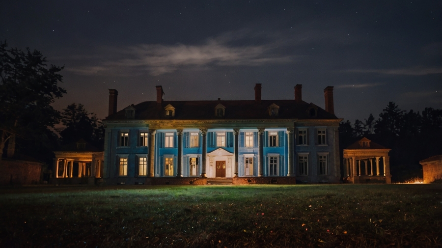 Создано при помощи Leonardo AI с прикреплением референсного изображения из оригинального проекта. Выбран стиль Cinematic. Промт: old noble manor at night, neon light, front view.
