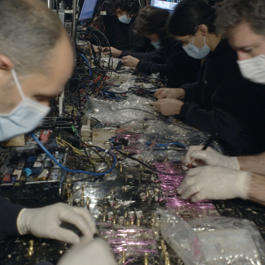 промт: scene: creative crew in Xyro gear gathered around MycoCore, mix of technicians and artists wearing matching techwear with purple accents #9B59FF, braided cables in hands, smiling and focused, warm cinematic lighting, candid documentary style, grain, no text