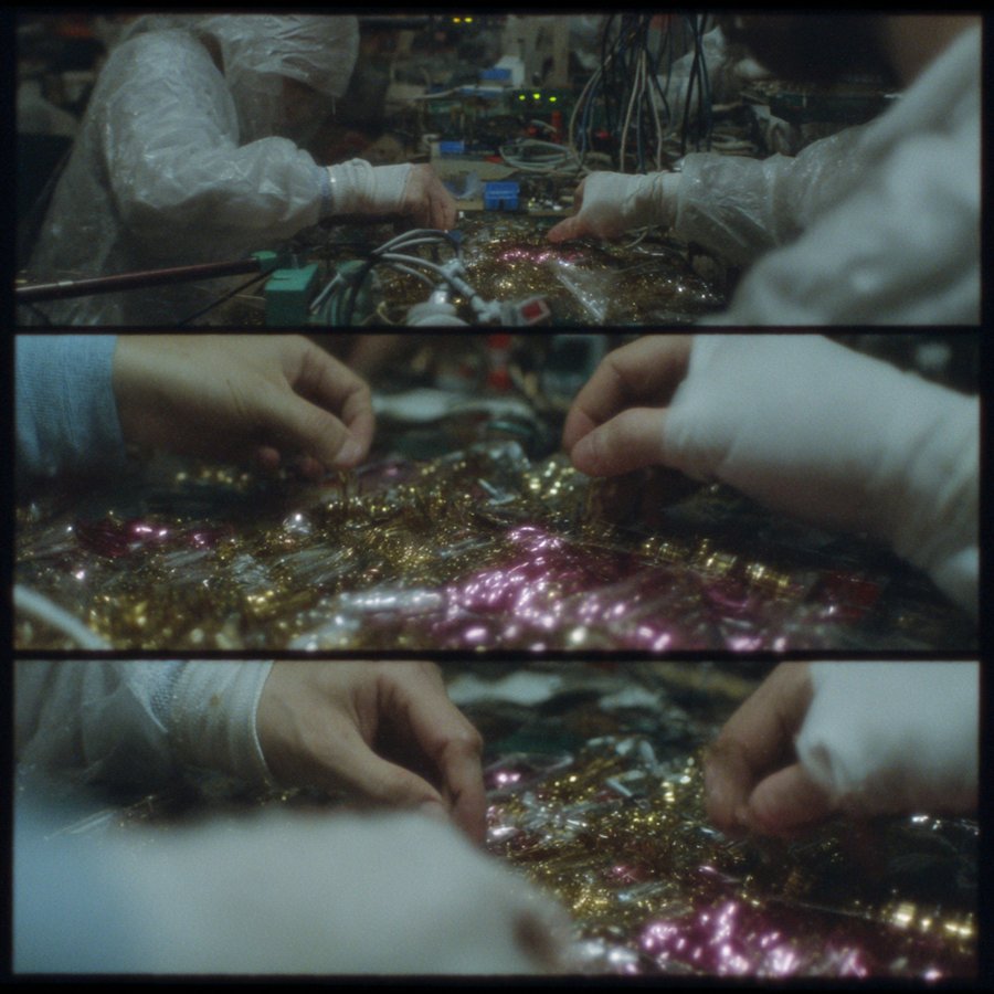 Xyro workshop in action, skilled technicians assembling MycoCore capsules and stitching mycelium-laced bags, gunmetal tools, purple inlay highlights #9B59FF, braided cables coiled and managed, candid closeups of hands, strong rim lighting, cinematic grain, professional focused atmosphere