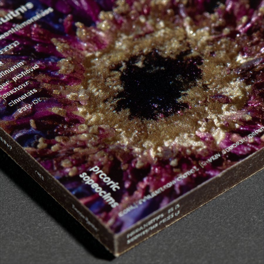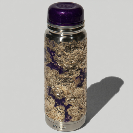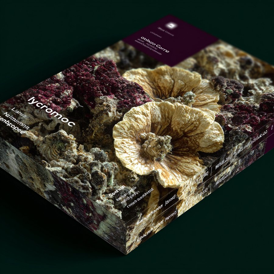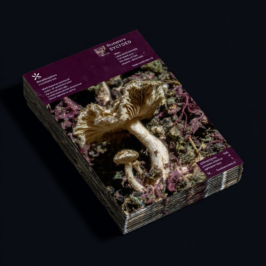 flyer mockup: compact Xyro flyer front, small mushroom-wire emblem top-left, hero product shot (MycoCore) center, gunmetal + purple palette, clean white bleed margins for copy placement, high-contrast lighting, grain texture, layout ready for headline and CTA placeholders, print-ready composition