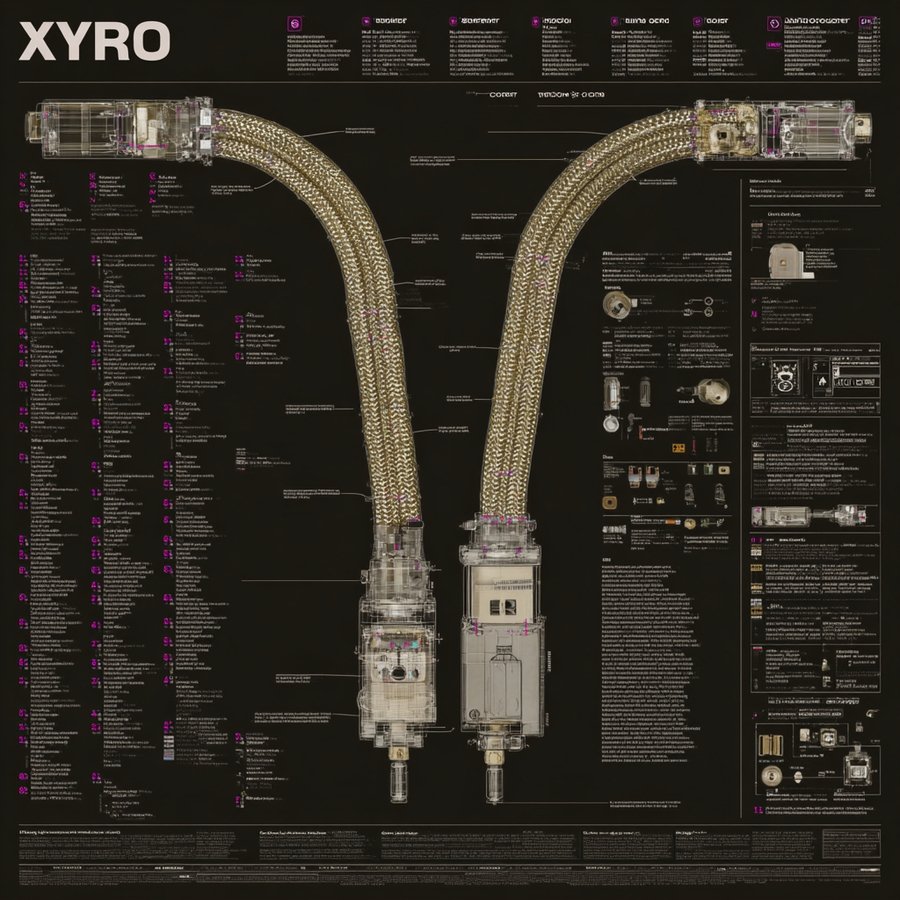 infographic poster: XYRO: mushroom sensor, braided cable, MycoCore, speaker output, stylized metallic icons and connector lines, gunmetal palette with purple accents #9B59FF, clean grid layout, numbered steps with small icon thumbnails, bold header «XYRO» and subtitle space, vector-friendly print-ready
