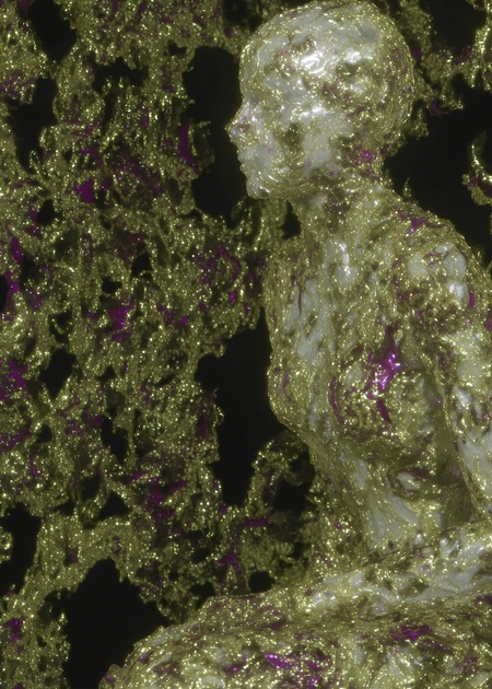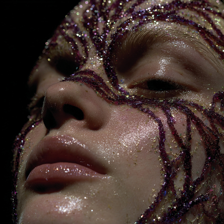 editorial makeup: model with full-face artistic makeup mimicking mycelium network thin purple veins (#9B59FF) radiating from eyes and temples, metallic gunmetal accents along cheekbones, bioluminescent speckles on forehead, glossy lips neutral, dramatic studio lighting, fashion editorial