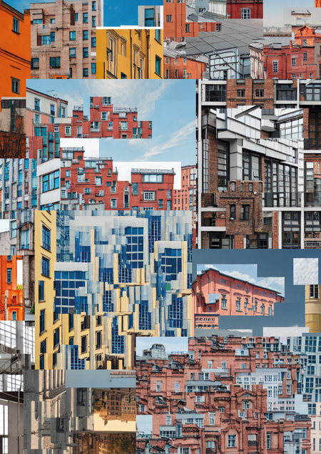 У нейросети хорошо получилось передать именно саму структуру коллажа, который я задумала (где элементы зданий накладываются друг на друга в хаотичном порядке), также получилось изобразить именно кирпичные здания, которые фигурируют на исходных изображениях. Некоторые даже очень похоже на здания НИУ ВШЭ. Также интересно, что есть изображения, где цвет кирпича ярко-оранжевый (как на исходном изображении 1), а есть где приглашенные цвета (исходные изображения 2 и 3).
