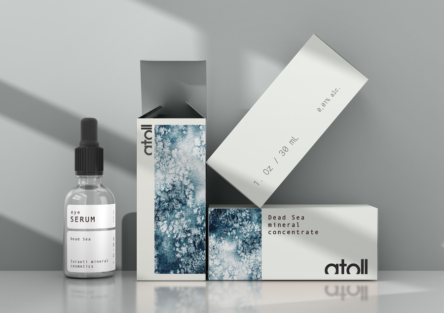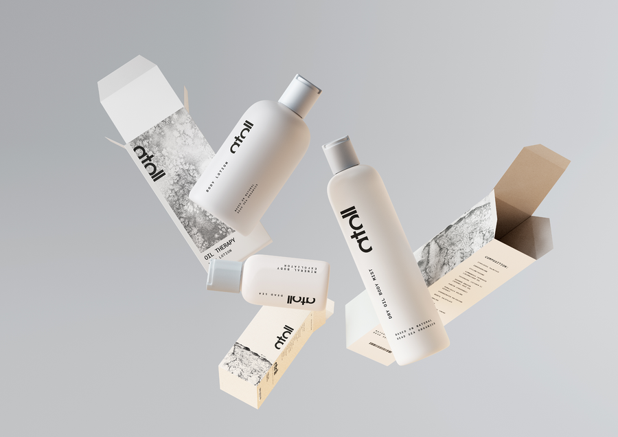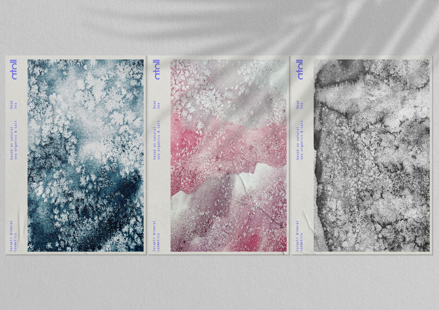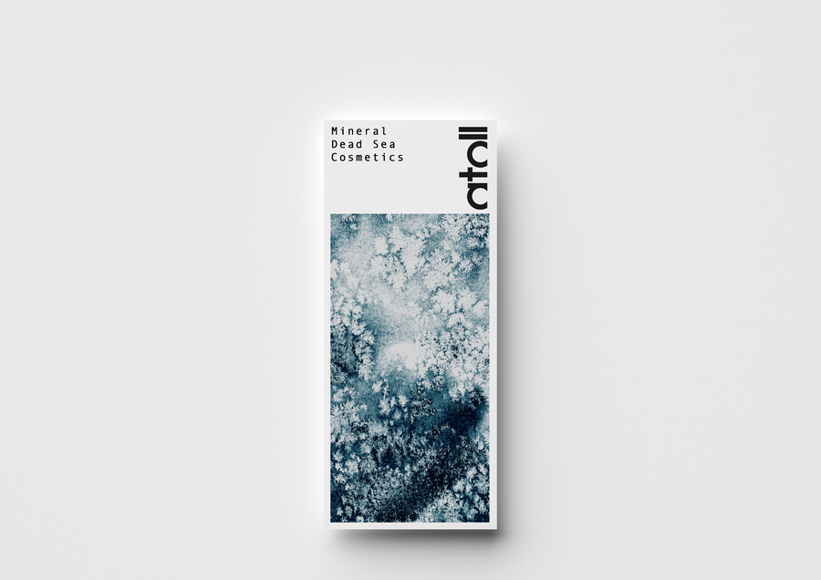 Atoll is a gentle but effective mineral care that helps the skin «float» above the effects of heat, wind and sun. Here comes the metaphor of «floating up» that directly related to the experience of swimming in the Dead Sea (with a lot of salt that pushes your body up) and to the logo, in which the letters seem to emerge from the water.