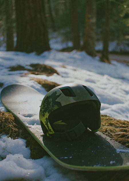 Photorealistic ski helmet covered with green moss in a snowy forest, eco-friendly winter gear, cinematic lighting