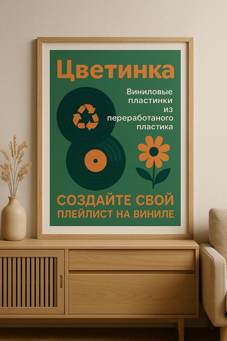 Цветинка — уникальный бренд по производству виниловых пластинок. Одно из главных преимуществ данного бренда является переработка пластика для создания винила, а так же не менее важной отличительной чертой является возможность создать свой персональный плейлист на виниле.