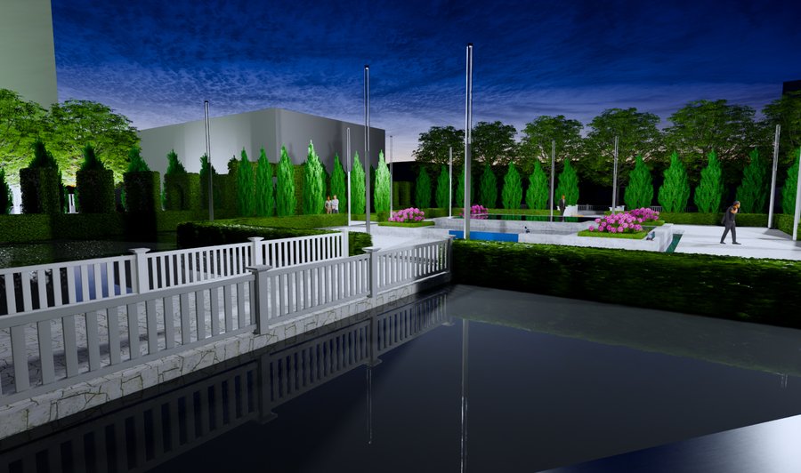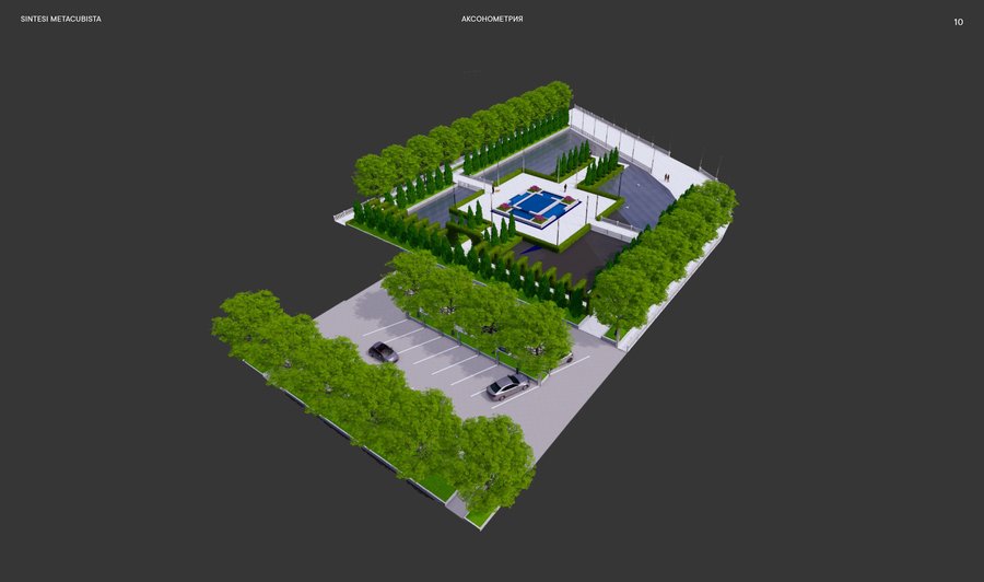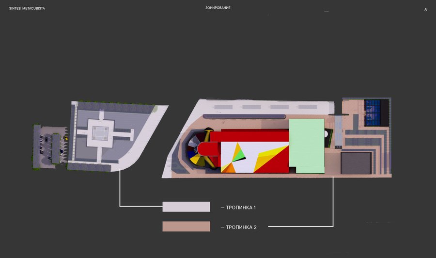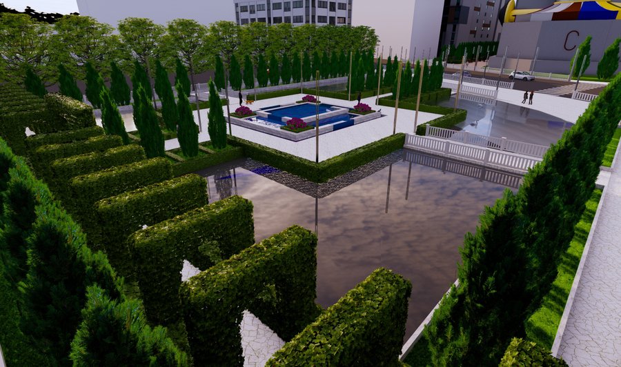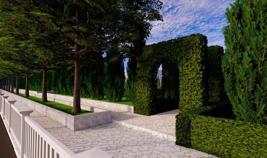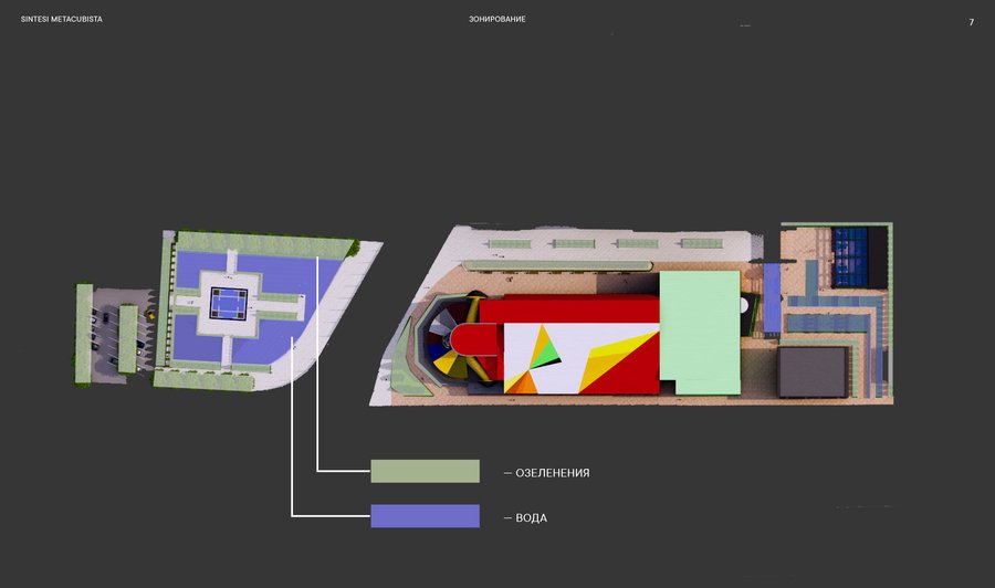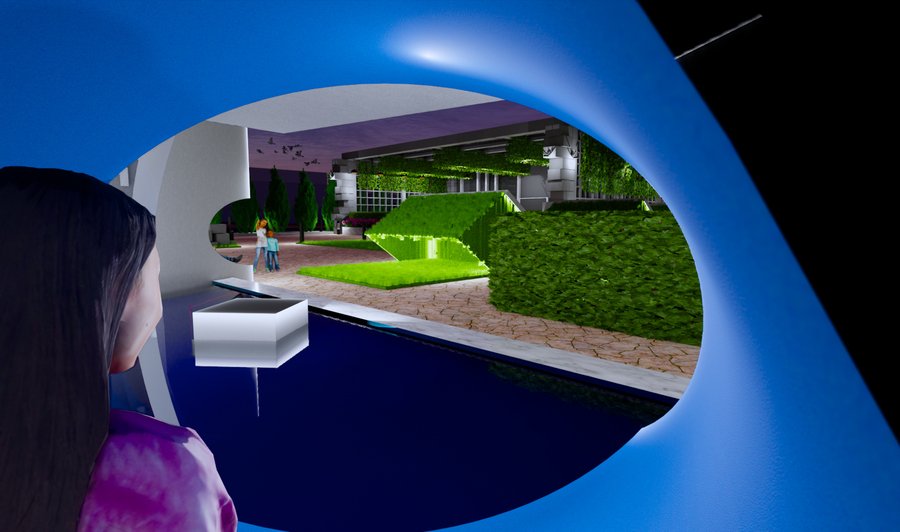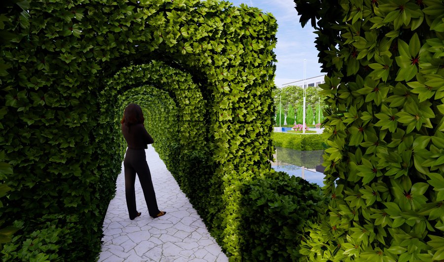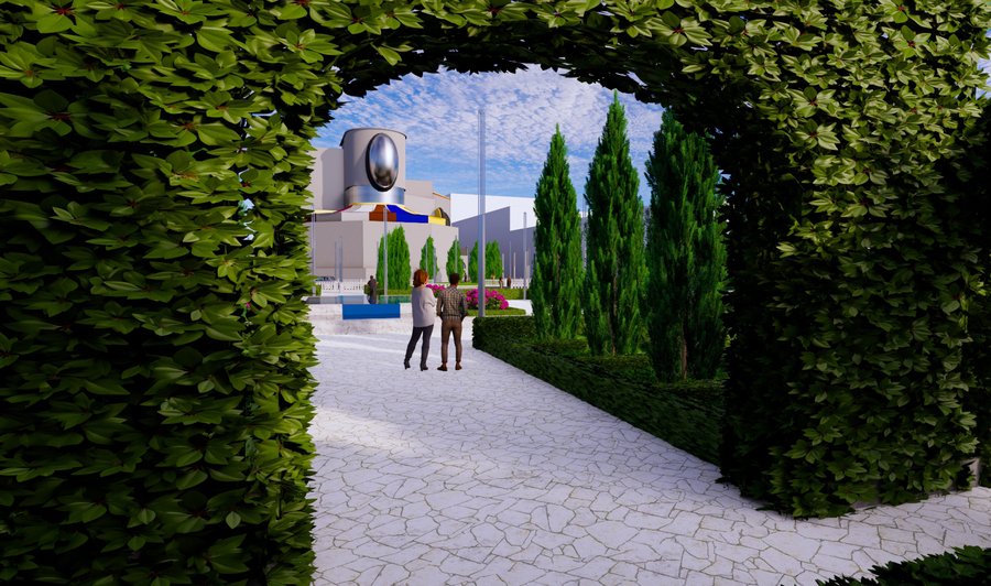 В зоне Метасквер находится фонтан, а вокруг озеленение под природу, парки и сады Италии. Зритель попадает в атмосферу, где царит природа и гармония.
