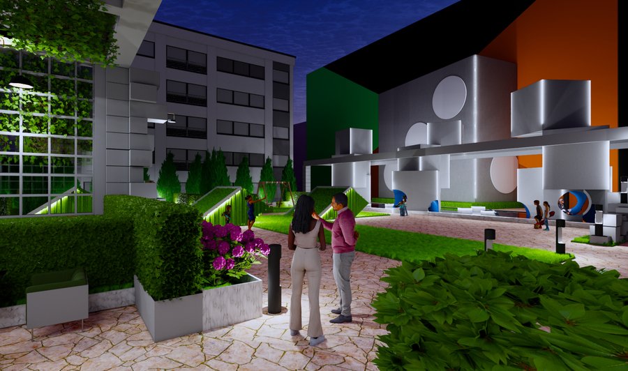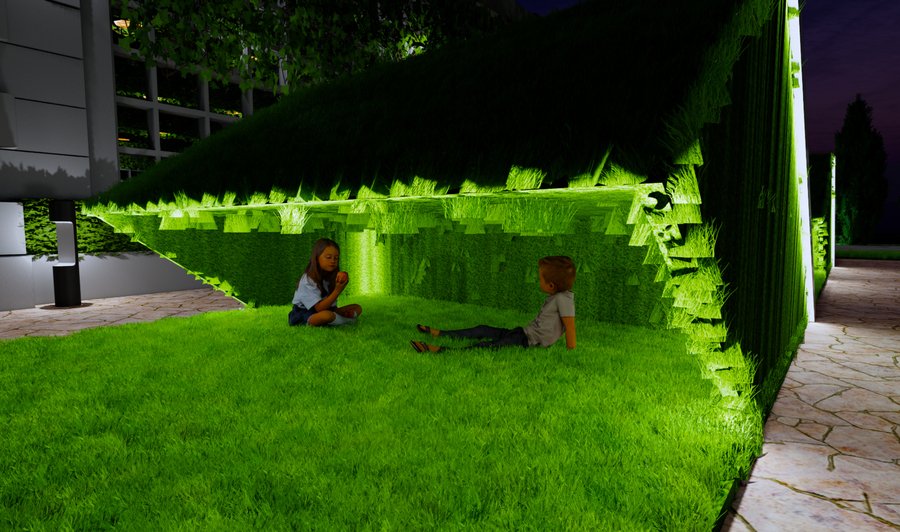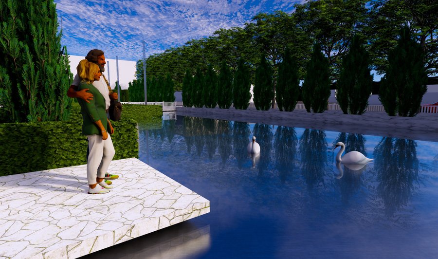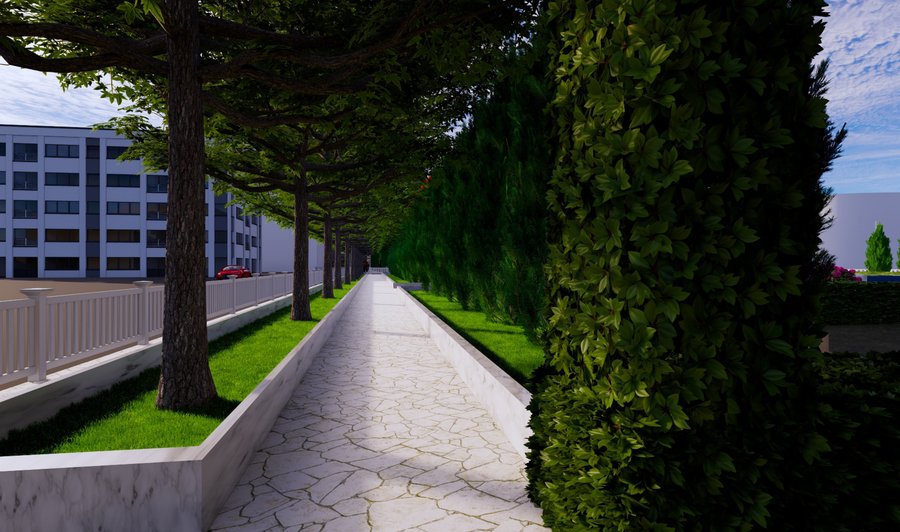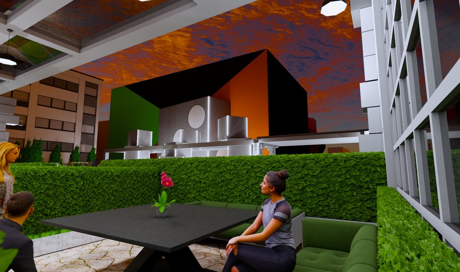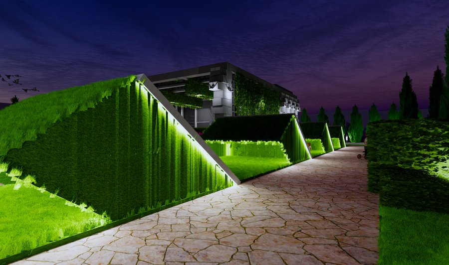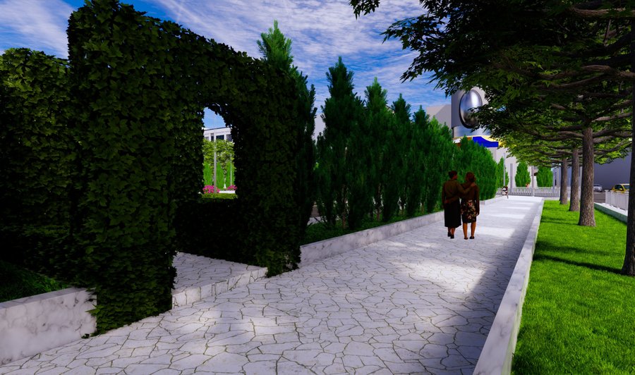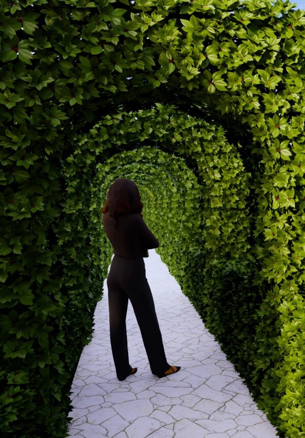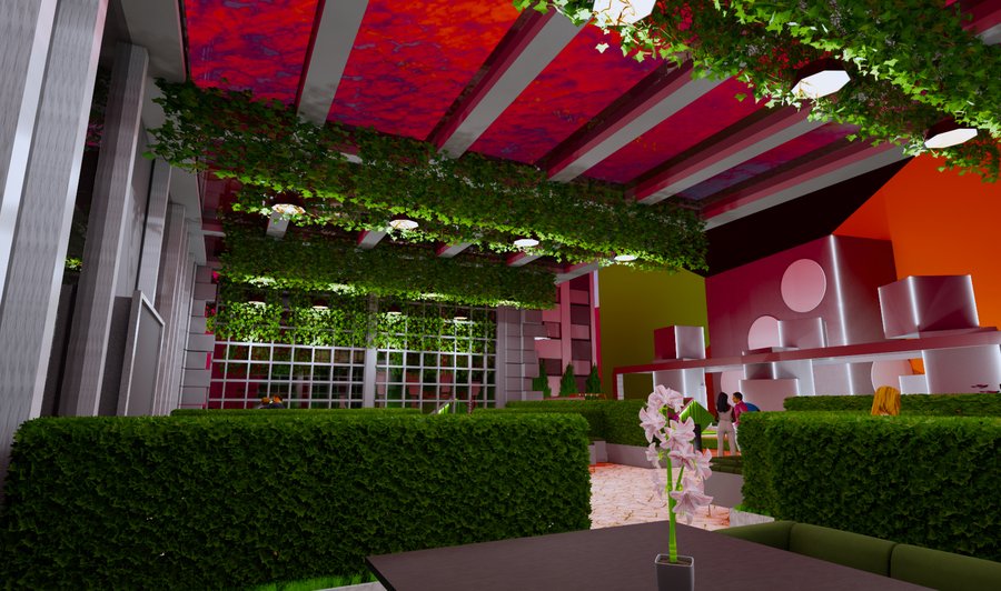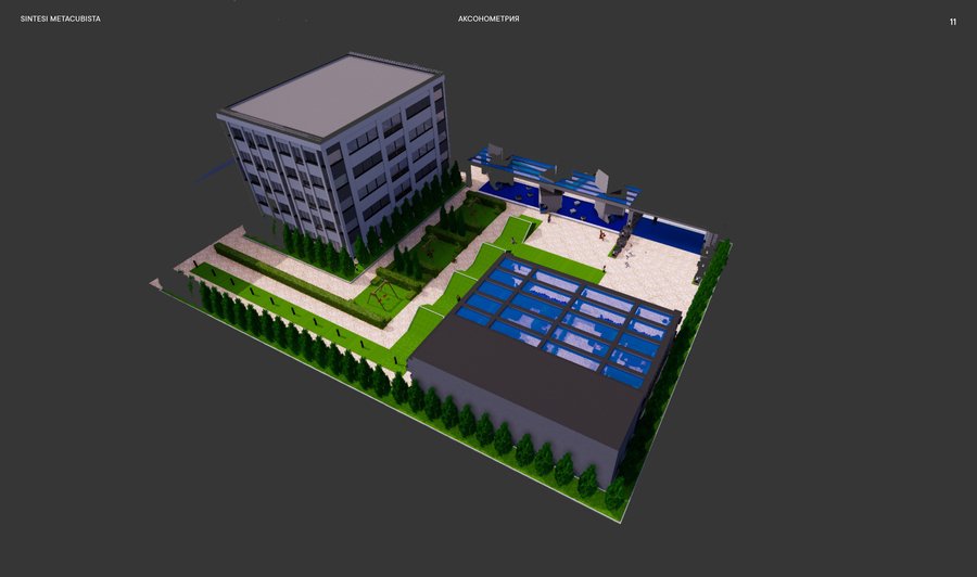 В зоне Метасквер находится фонтан, а вокруг озеленение под природу, парки и сады Италии. Зритель попадает в атмосферу, где царит природа и гармония.