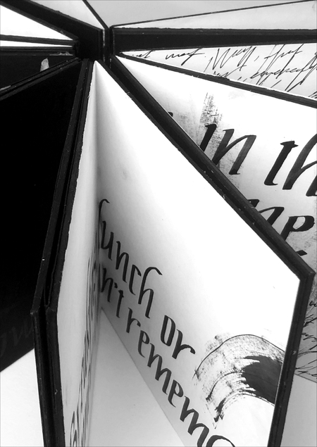 Книга о тревожных мыслях, которые влияют на повседневность. Арт-бук сделан в виде гармошки для отображения масштабности влияния мыслей и для того, чтобы показать их периодичность, он не имеет начала и конца, мысли перетекают одна в другую.