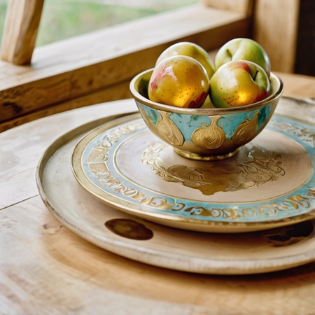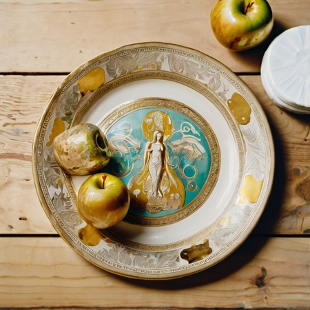 Prompt: A beautifully crafted ceramic plate resting on a rustic wooden table, designed in an ancient Greek style. The plate features intricate illustrations of Greek goddesses in flowing robes, gracefully positioned around golden apples, with fine decorative patterns inspired by classical pottery. The setting is enhanced with warm, natural lighting, casting soft shadows, and complemented by elements like olive branches, a linen napkin, and a small bowl of ripe fruit in the background. The overall atmosphere conveys elegance, artistry, and a connection to Greek mythology.