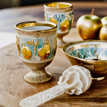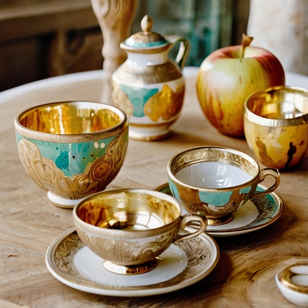 Prompt для чаш: A set of finely crafted ceramic cups and goblets arranged elegantly on a rustic wooden table, designed in an ancient Greek style. Each piece is adorned with detailed illustrations of Greek goddesses and golden apples, framed by intricate patterns inspired by classical Hellenistic art. The table setting includes accents like olive branches, a white linen tablecloth, and scattered golden apple motifs. Warm, natural light enhances the textures and artistry of the ceramics, creating a harmonious and mythological ambiance.