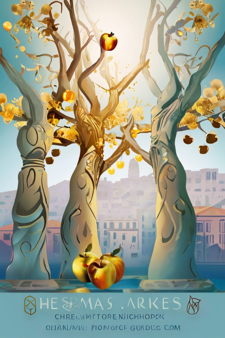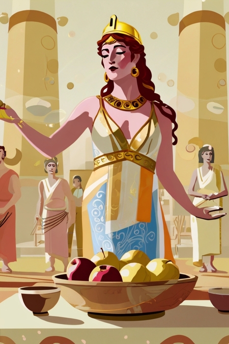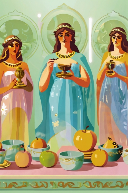 Prompt: A vibrant poster for the ceramic workshop «Apples of the Hesperides,» featuring an enchanting scene of three Greek goddesses in flowing, elegant robes. They are holding and offering golden apples, surrounded by intricately designed ceramic plates, cups, and goblets in the foreground. The backdrop is a grand feast with a lavish table overflowing with Mediterranean delicacies, amphorae, and golden apple motifs. The goddesses are central to the composition, exuding grace and mythological charm. The style is artistic and detailed, blending classical Greek aesthetics with modern elegance, and the text highlights the workshop’s name in an ornate Greek-inspired font.