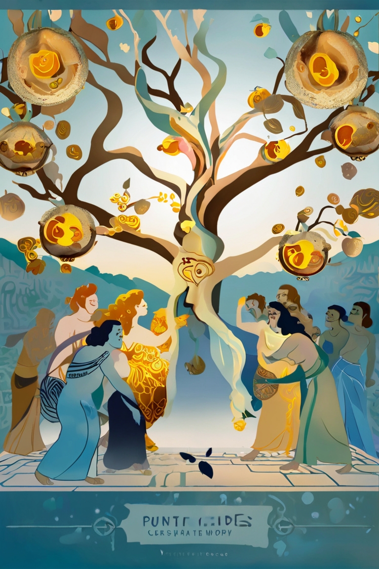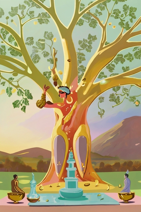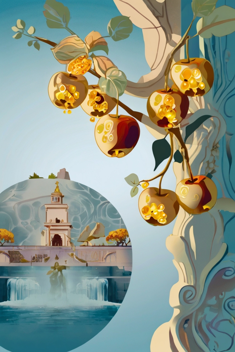 Promt: A flat illustration of three ancient Greek goddesses dancing gracefully in a lush garden filled with golden apple trees. The goddesses are wearing flowing white and gold robes inspired by ancient Greek fashion, with intricate detailing. The setting is vibrant, featuring golden apples hanging from the trees, bright green foliage, and a serene background with soft blue skies. The composition is elegant and harmonious, emphasizing the mythical and divine atmosphere. The color palette combines gold, white, and green tones to highlight the richness of the scene.