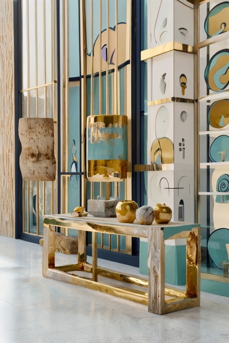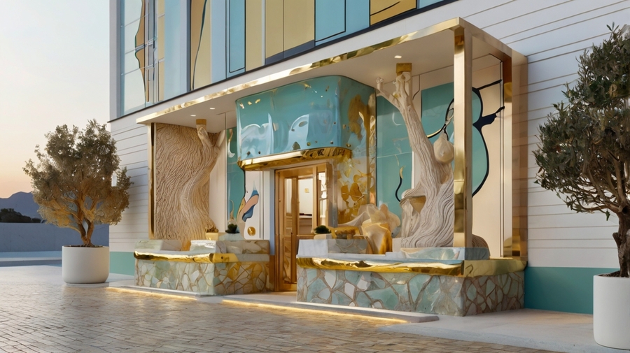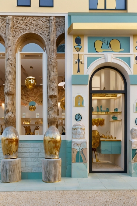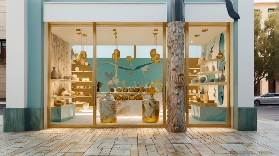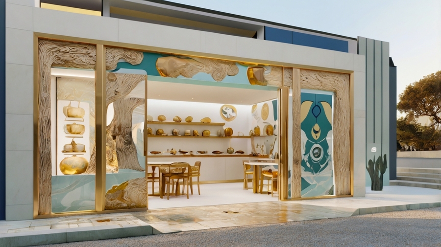 Prompt: A storefront design for the ceramics workshop «Hesperides Apples» in a modern style with elements of antiquity. The facade features sleek, clean lines and large glass windows that provide a view of the elegant interior. Inside, displays of handcrafted ceramics are highlighted, adorned with intricate depictions of ancient Greek goddesses and golden apples. The entrance is framed by pillars resembling ancient Greek architecture, but reinterpreted in a minimalist, modern aesthetic. Soft ambient lighting creates a warm, inviting glow, while gold accents and subtle decorative motifs inspired by Greek mythology blend seamlessly with the contemporary design. The storefront exudes sophistication, bridging classical themes with modern retail elegance.