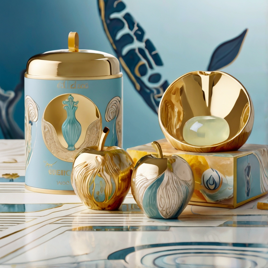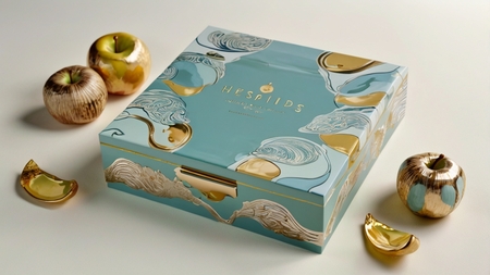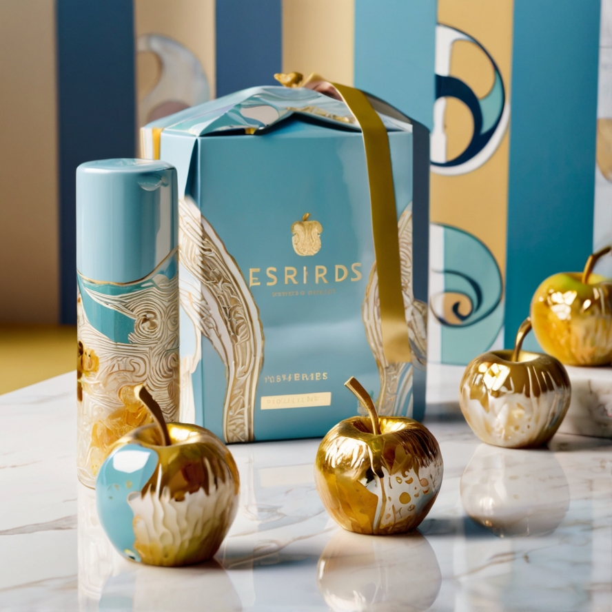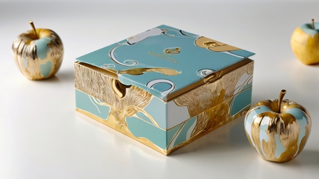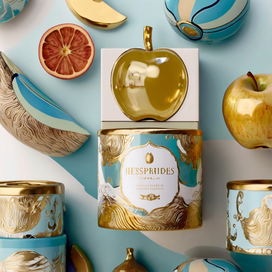 Prompt: Packaging boxes for the ceramics workshop «Hesperides Apples,» designed with a luxurious and elegant aesthetic. The boxes are crafted in matte white with gold foil accents. The lid features a minimalist golden apple tree motif, its branches forming intricate, flowing patterns reminiscent of ancient Greek art. Along the sides, delicate line illustrations of Greek goddesses are subtly embossed, creating a textured, tactile experience. The brand name, «Hesperides Apples,» is elegantly written in a modern serif font, with a golden finish. Inside, soft tissue paper printed with golden apple patterns wraps the ceramics, ensuring both beauty and protection. The design combines classical mythology with contemporary sophistication, making the unboxing an exquisite experience.