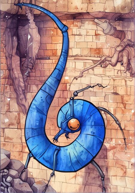 the drawing of an alien oblong insect with a shell of shields on its back and thin legs in blue shades with white oblong eyes is painted with brickwork in the wall, there is a passage in the middle, brick walls, in the style of watercolor paints, yellow, blue, brown colors prevail, 4k