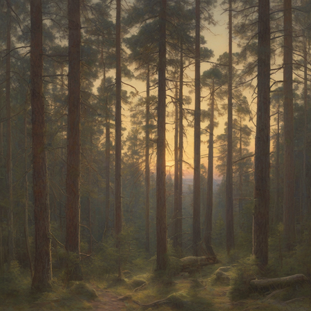 8. Twilight in the Pine Forest *"The fading light of dusk in a dense pine forest, with long shadows stretching across the forest floor. A faint glow lingers in the sky, and an owl perches on a high branch. The atmosphere is calm and mysterious, painted with Shishkin’s