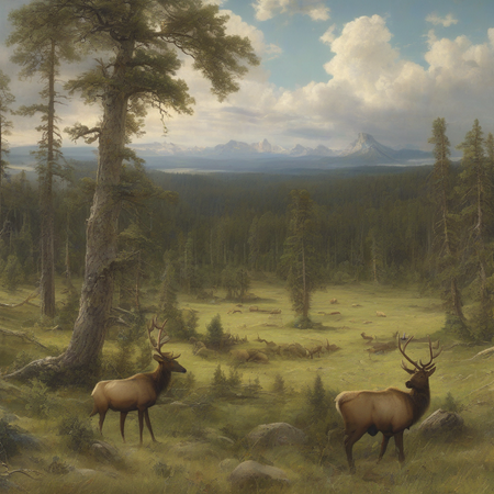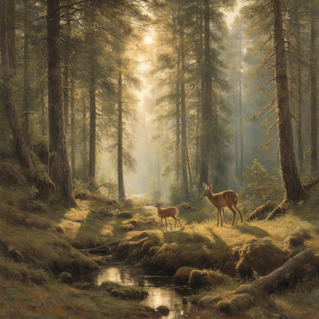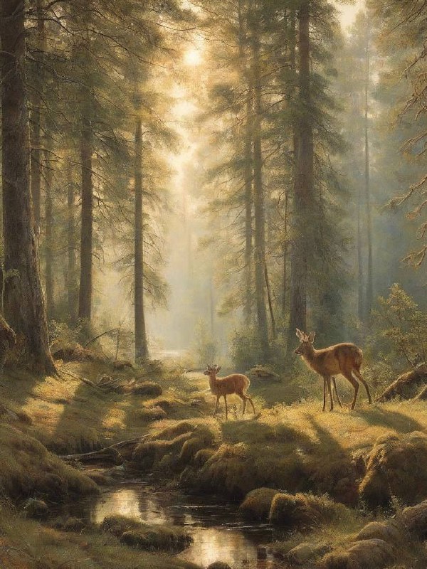 1. Dense Morning Forest "A serene, sunlit morning in a dense Russian forest, with towering pine trees covered in morning mist. Sunbeams pierce through the foliage, illuminating patches of moss-covered ground. A small deer stands near a quiet stream. Highly detailed, realistic oil painting in Shishkin’s style.»