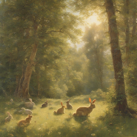 4. Sunlit Meadow at the Edge of the Woods *"A sun-drenched meadow bordered by a thick forest, with wildflowers swaying in the breeze. A family of rabbits grazes near the tree line. The sunlight filters through the leaves, creating a soft, dappled effect.