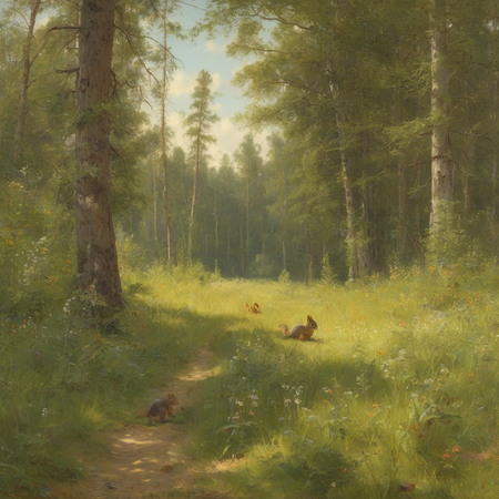 9. Summer in the Forest Clearing "A bright summer day in a sunlit forest clearing, with tall grass and scattered wildflowers. Butterflies flutter around, and a squirrel climbs a tree trunk. The painting radiates warmth and life, executed in Shishkin’s precise, naturalistic style.»