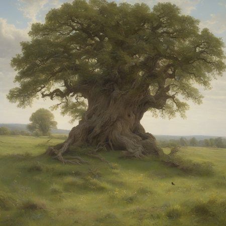 Ancient Oak in an Open Field "A massive, centuries-old oak tree stands alone in a vast field, its gnarled branches spreading wide. The grass is dotted with wildflowers, and birds nest in the tree’s hollows. The painting emphasizes texture and depth, just like Shishkin’s famous 'Oak Grove'.»