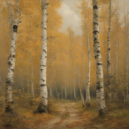 2. Golden Autumn Birch Grove "A peaceful autumn scene in a birch forest, with golden leaves covering the ground. The white bark of the trees contrasts with the warm yellow and orange foliage. A narrow path winds through the trees, inviting the viewer into the painting. Shishkin’s signature realism and attention to detail.»