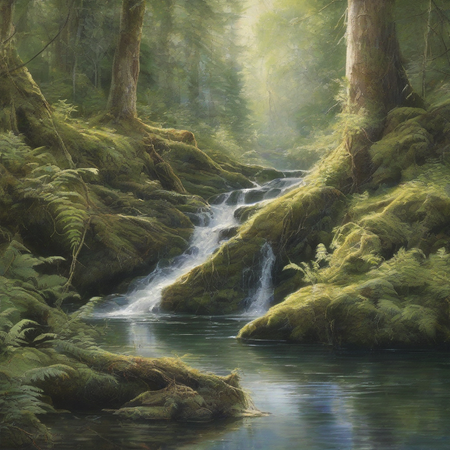 Forest Stream with Waterfall "A crystal-clear forest stream cascades over rocks, forming a small waterfall. Ferns and moss grow along the banks, and sunlight sparkles on the water’s surface. A woodpecker can be seen on a nearby tree. A highly detailed, tranquil nature scene.»