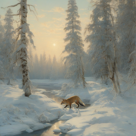 5. Winter Silence in the Taiga "A quiet winter scene in the Russian taiga, with snow-laden fir trees under a pale blue sky. A frozen river reflects the sunlight, and a fox cautiously steps through the snow. The painting captures the crisp, silent beauty of winter, reminiscent of Shishkin’s 'Winter in the Forest'.»
