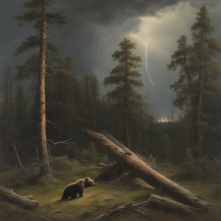 3. Storm Over the Forest "A dramatic landscape of a dark, stormy sky over a vast pine forest. The wind bends the trees, and distant lightning flashes. A lone bear walks near a fallen log. The mood is intense yet majestic, painted with Shishkin’s precise brushwork.»