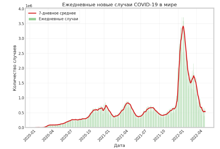 Данные группируются по датам для анализа глобальных тенденций. Добавляется 7-дневное скользящее среднее для сглаживания ежедневных колебаний.