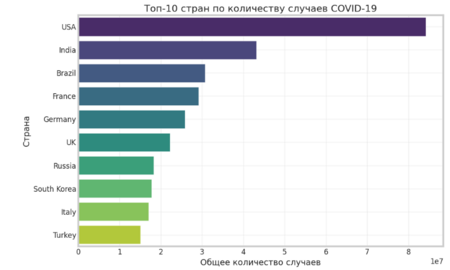 Проект представляет собой комплексный анализ данных о COVID-19, начиная от загрузки и предварительной обработки данных и заканчивая визуализацией и формулированием выводов. Он позволяет не только понять глобальные тенденции, но и сравнить ситуацию в разных странах, что делает его полезным инструментом для исследователей, врачей и политиков.