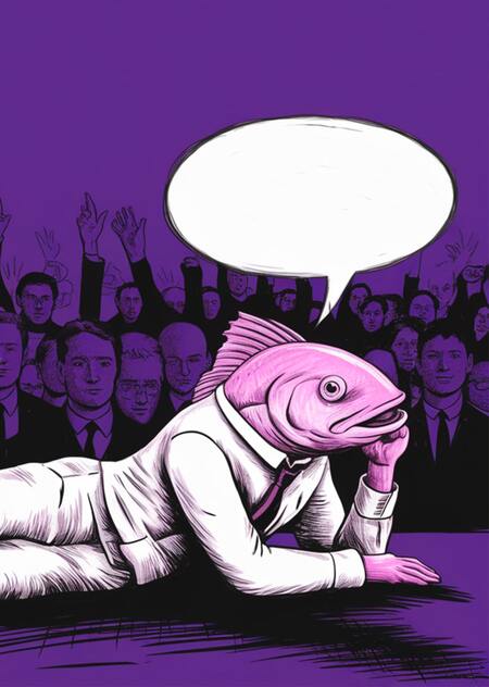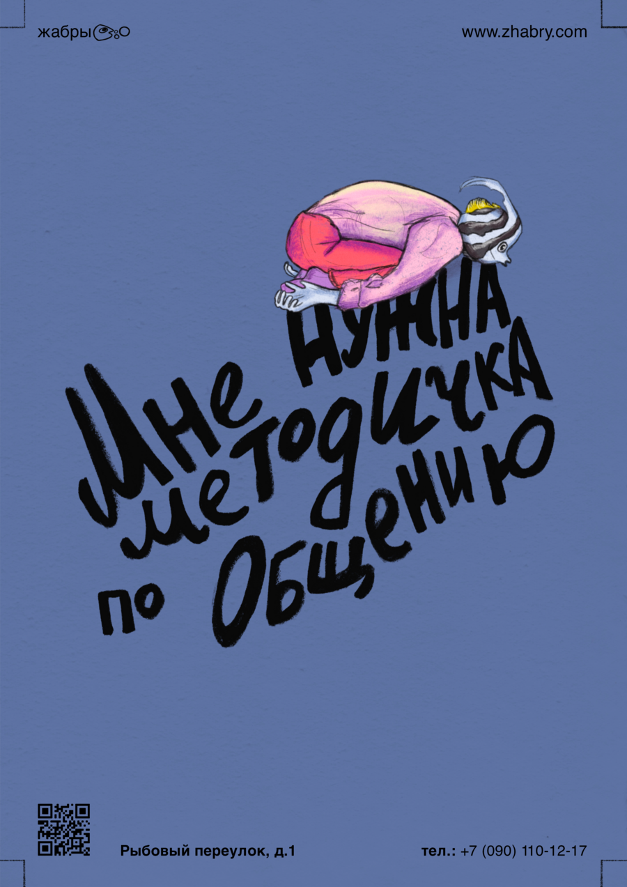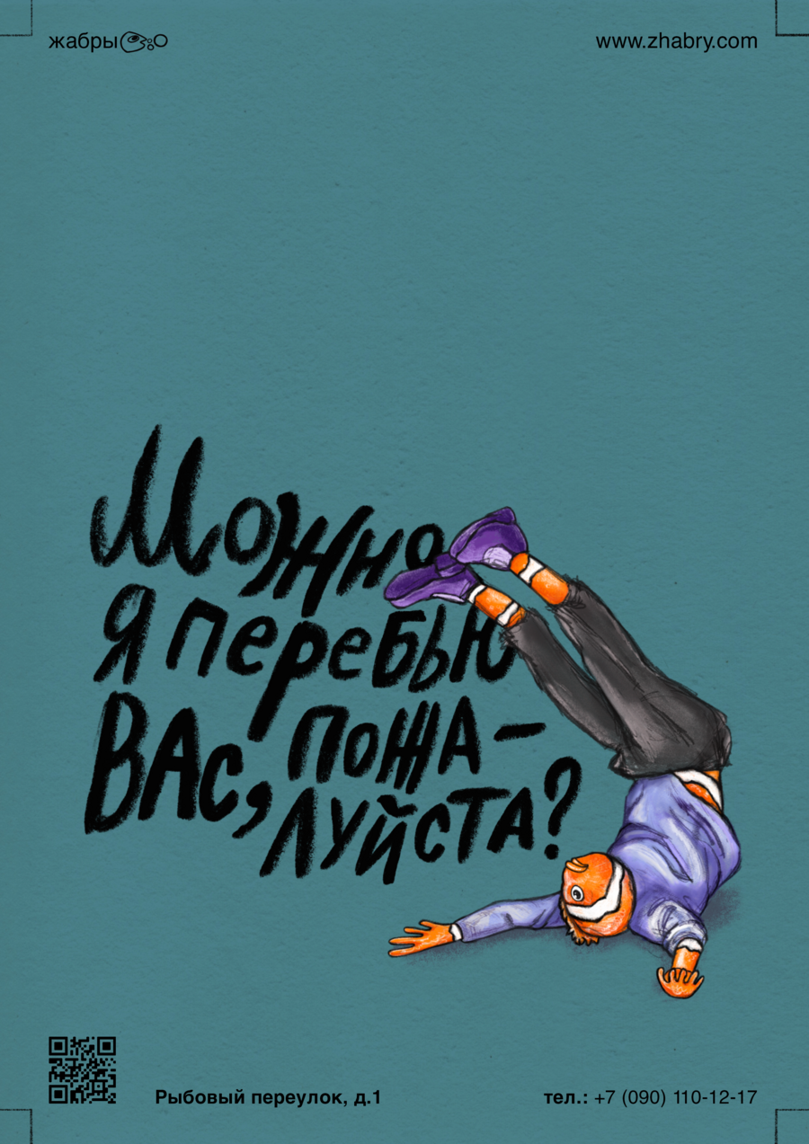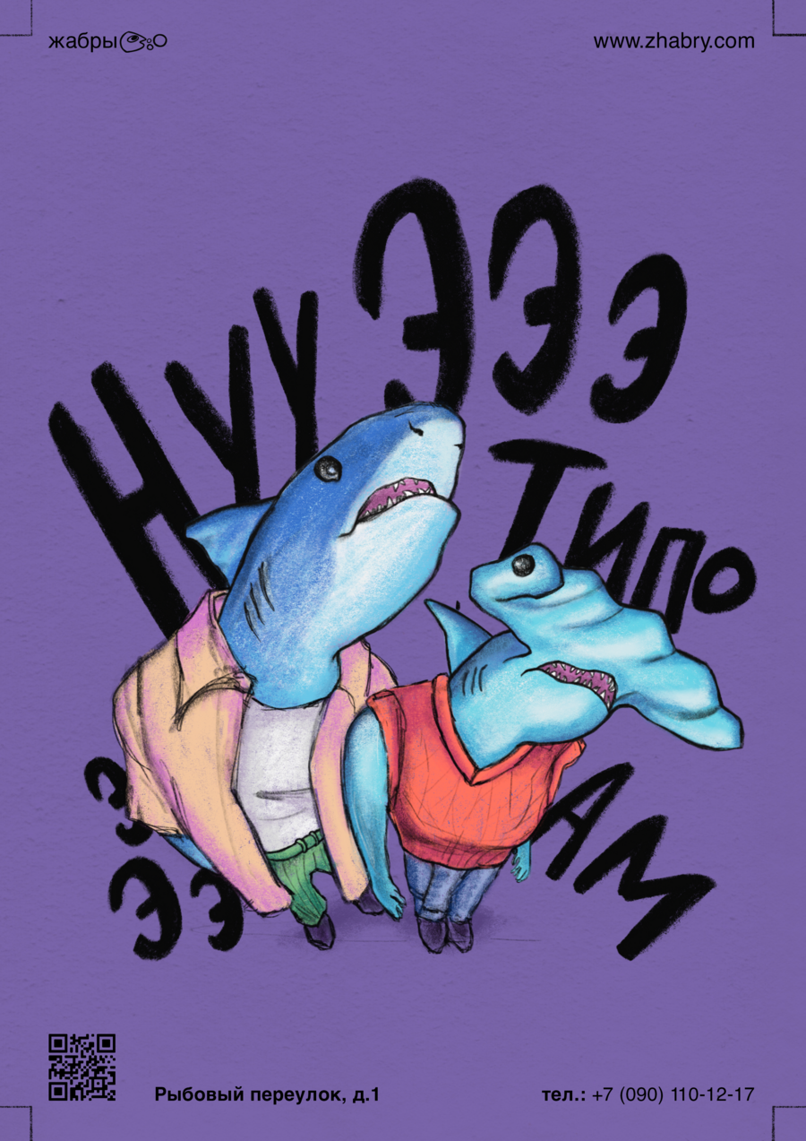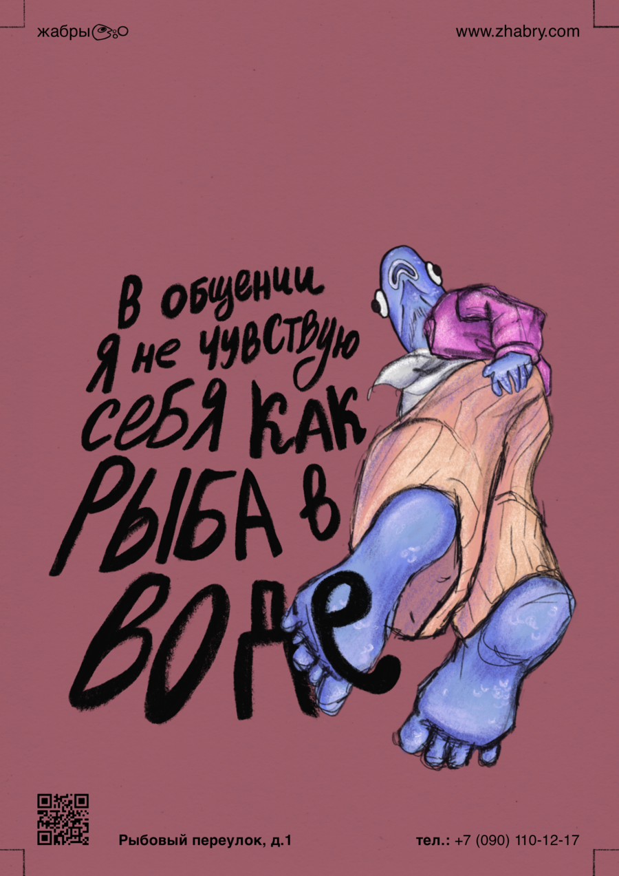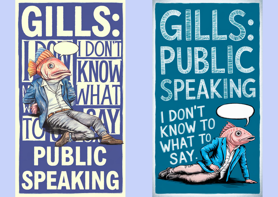 Model: 2.0 Preset: Auto Промпт: «A crayon drawing of a blue poster with the text „GILLS: Public Speaking“. In the middle of the composition, there is a fish-headed person dressed in human clothing is lying on the ground. The background contains words with the text „I don’t know what to say“. There is a speech bubble above the fish-headed person’s head.».