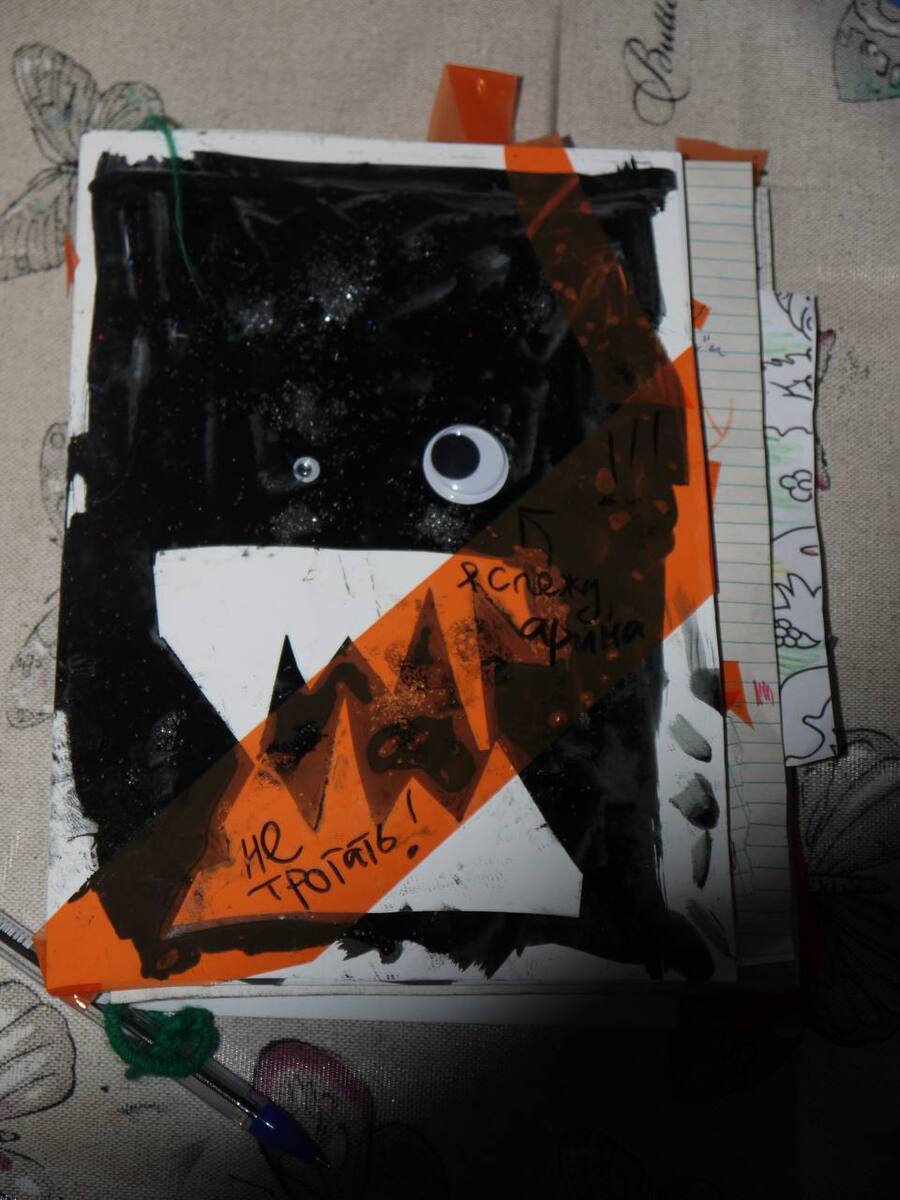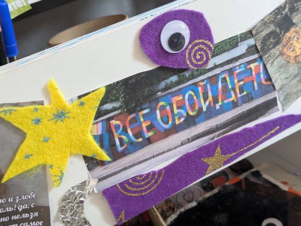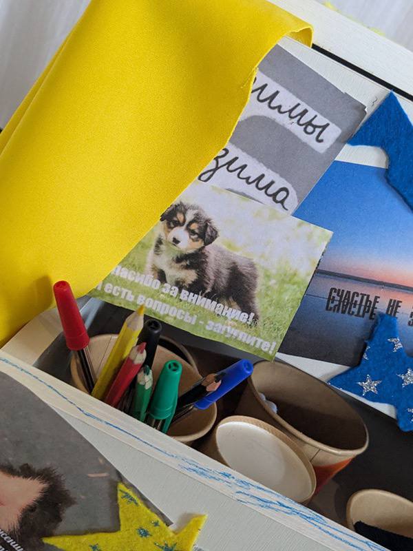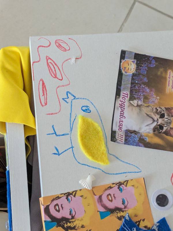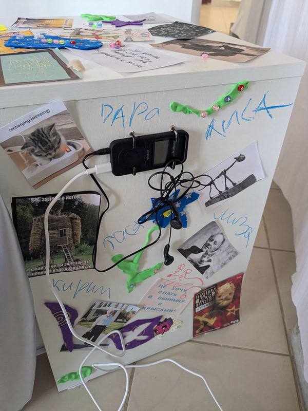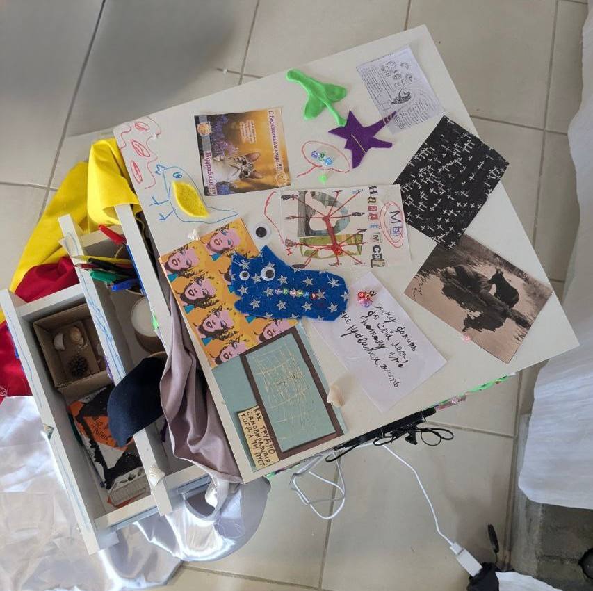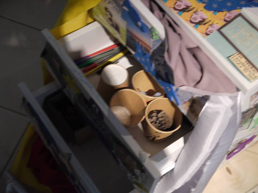 Весь ящик обклеен картинками: мемами, картинами, фотографиями деятелей искусства, которые передают внутренний мир, интересы подростка, его культурный код. Кроме того само оформление комода — процесс беспорядка, обычно комод стоит чистый и аккуратный, а здесь — хаотичные подписи, наклейки, бусины, будто бы собранный мусор положили не в корзину, а наклеили на стену, будто бы делая свой вариант граффити.