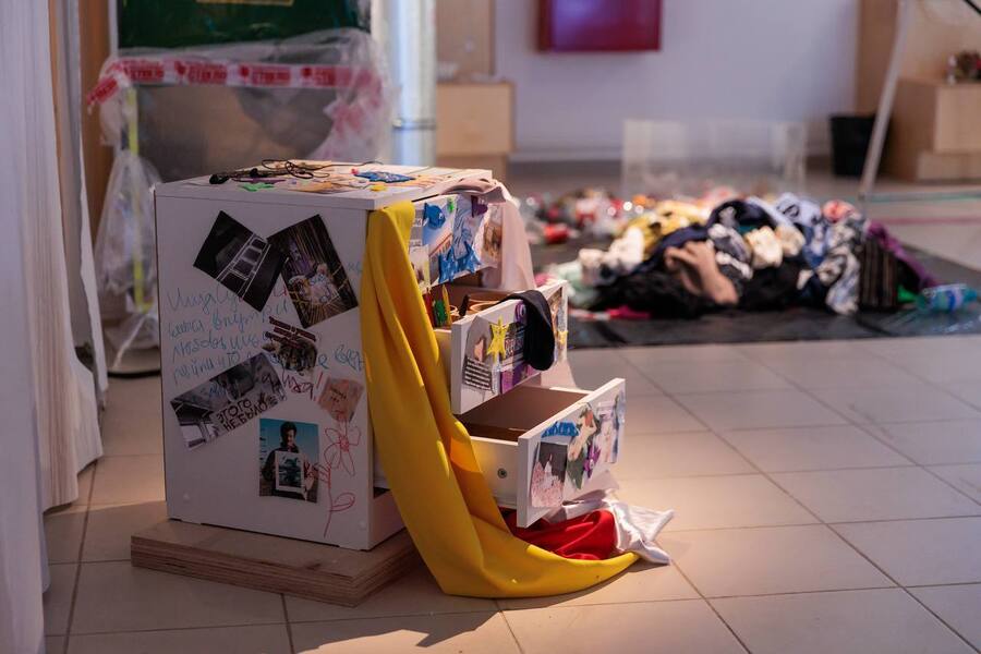 раздел 2: процесс разрушения. Временная изменчивость путем тактильгого взаимодействия зрителя с объектом. Комод- выражение чужой личности через объекты, наделенные подростком (владельцем) сакральным значением. Тактильное взаимодействие зрителя, разрешенное автором работы (выдвижение ящиков, разглядывание вещей, некоторые зрители их даже забирали) — постоянное разрушение этого комода: изначальная позиция ящиков меняется, вещи перекладываются или изымаются зрителем. В каком-то смысле комод — социальный эксперимент личных границ: увидев чужую вещь будем ли мы ее изучать или обойдем стороной?