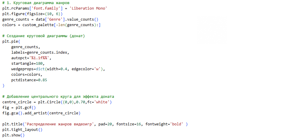 хорошо показывает доли категорий (жанров) в общем распределении. это удобно для визуального восприятия, когда важно показать, какие жанры доминируют и какие имеют меньшую популярность.