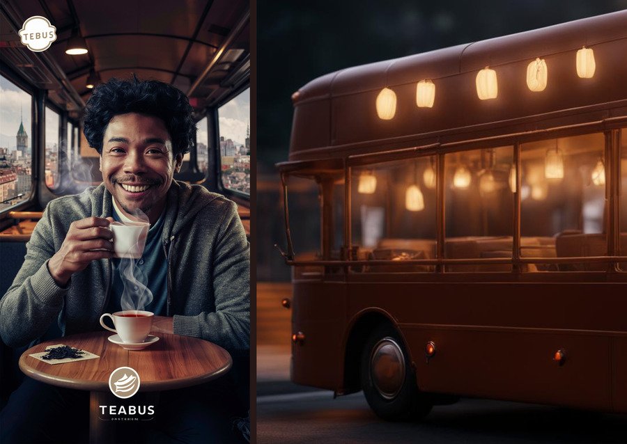 1. Для первого постера: ideogram — photorealistic poster for the brand TEABUS. A photo of a woman warming herself on a warm paper cup of tea while sitting at a table on the bus Для второго постера: ideogram — photorealistic poster for the brand TEABUS. A photo of a happy man drinking a paper cup of tea while sitting at a table on the bus 2. Kandinsky — Смешивание (картинка + картинка)