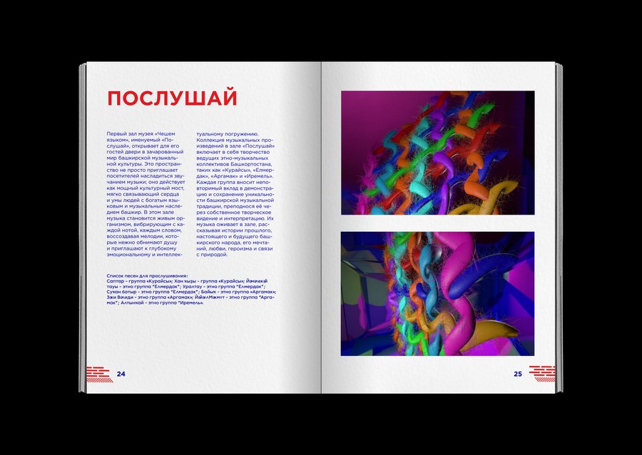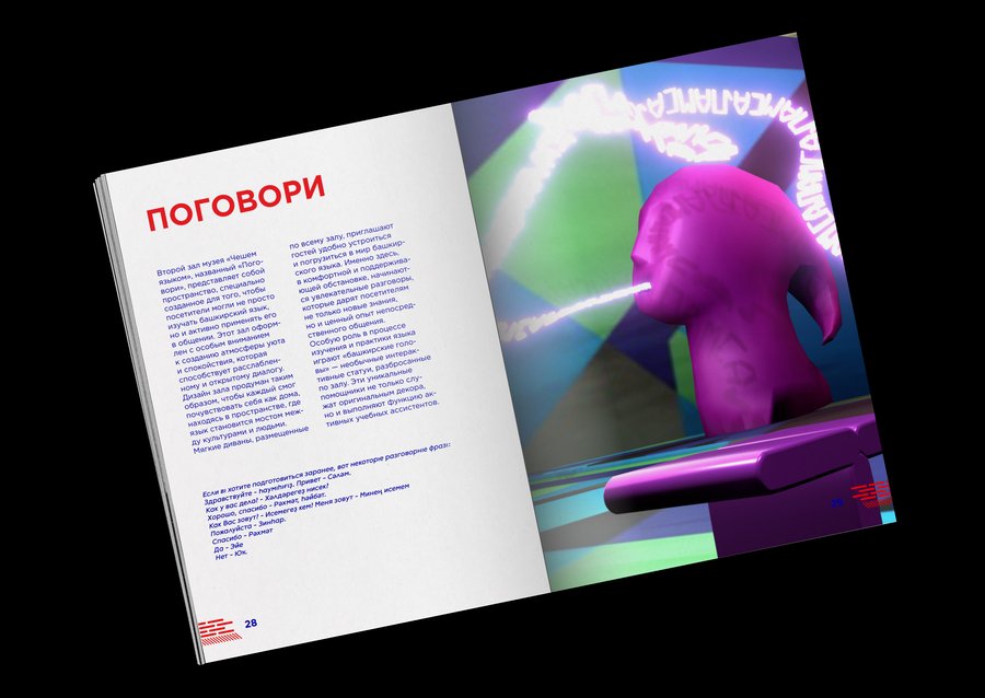Здание музея в форме треугольника, вдохновленной эчпочмаком. Внутри гипнотизирующие комнаты, в которых есть возможность прикоснуться к башкирскому: поговорить, послушать и посмотреть.