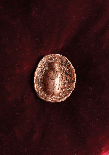 Медная скульптура-амулет позволяет зрителю владеть переживанием и приглушать окружающий мир, погружаясь в самого себя. Используемая в работе медь подчеркивает принадлежность к амулетам, которые раньше носили как обереги, наделяя их защитными свойствами.