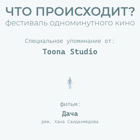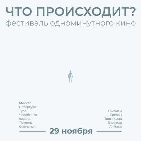 Оказалось, что мой фильм идеально подходит для фестиваля одноминутного кино «Что происходит?». Небольшой хронометраж и ответ на поставленный вопрос были главными критериями для отбора, в то время как формат не ограничивался ничем.