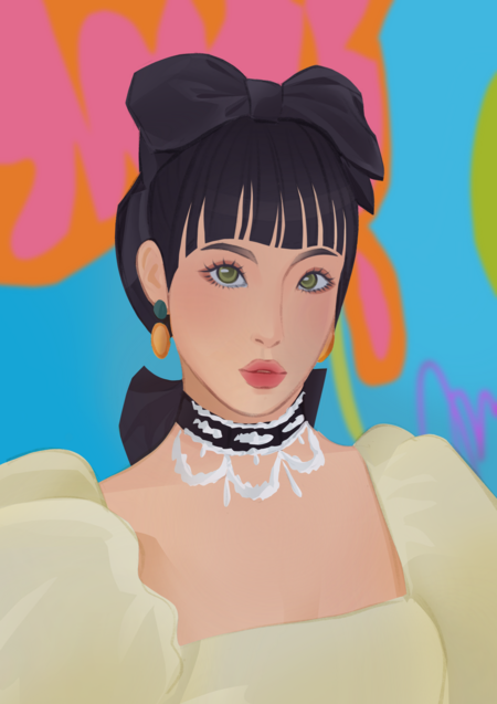 Особенности стиля: использование аэрографа и лассо, стилизованные волосы и складки, «рендер» поверхностей с отчетливым контуром после лассо и аэрографа, следы «карандашного» контура.