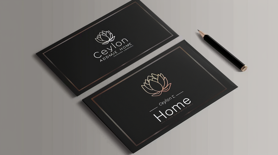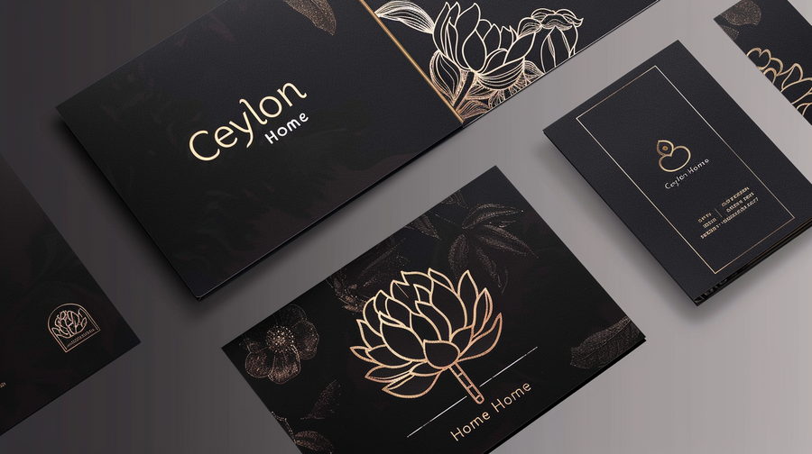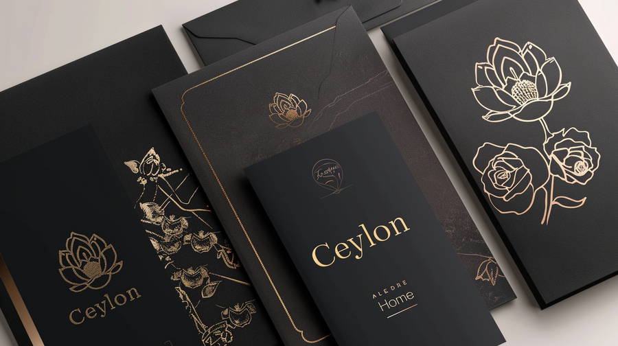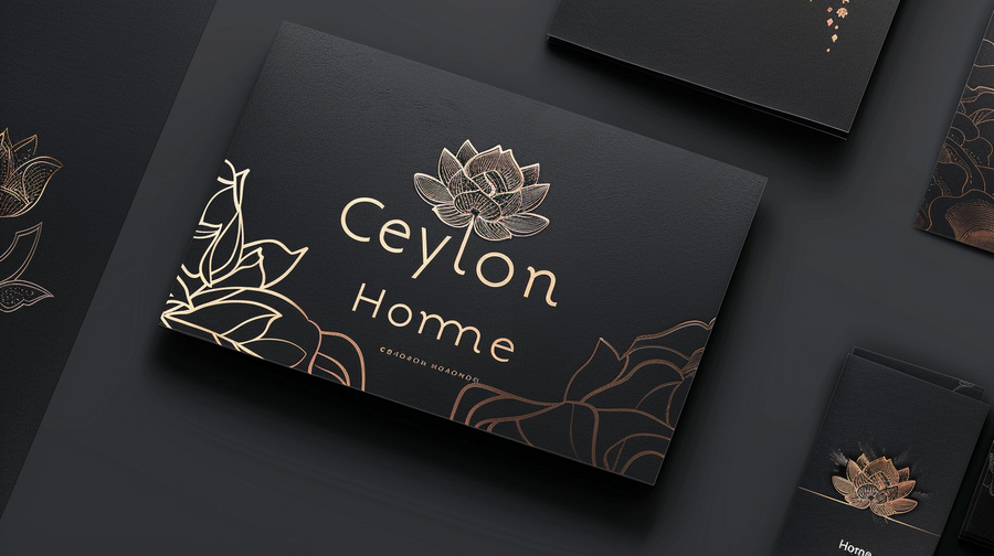 /imagine prompt: Create a print layout (paper, envelope, business cards) on a white background for the «Ceylon Home» brand, inspired by the rich traditions of Asia, using dark muted shades --ar 16:9 --v 6.0