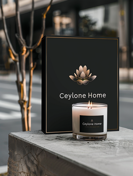 /imagine prompt: A mocap of the promotional poster that hangs on the building. The poster is inspired by the rich traditions of Asia for home goods brand Ceylone Home. The image features a Ceylone Home candle. Printed on high quality paper, the poster features «Ceylone Home» in bold lettering. --ar 16:9 --v 6.0