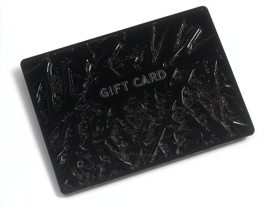 Промт для подарочной карты: «Black rectangular plastic gift card with chaotic patterns. On white. In the center of the card, „GIFT CARD“ is succinctly written in HELVETICA font»
