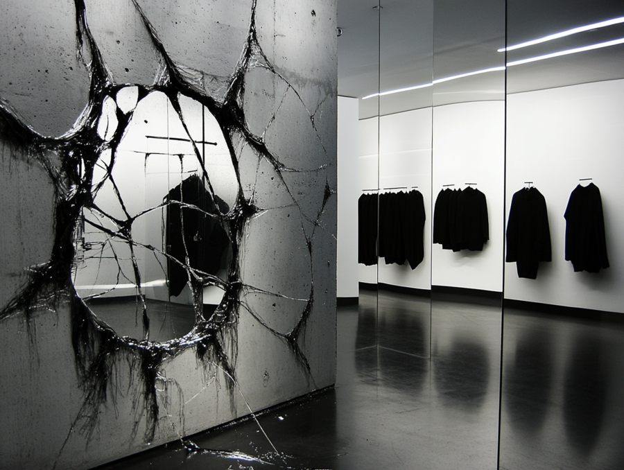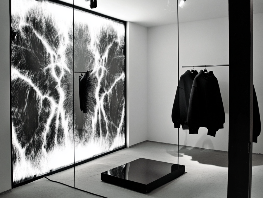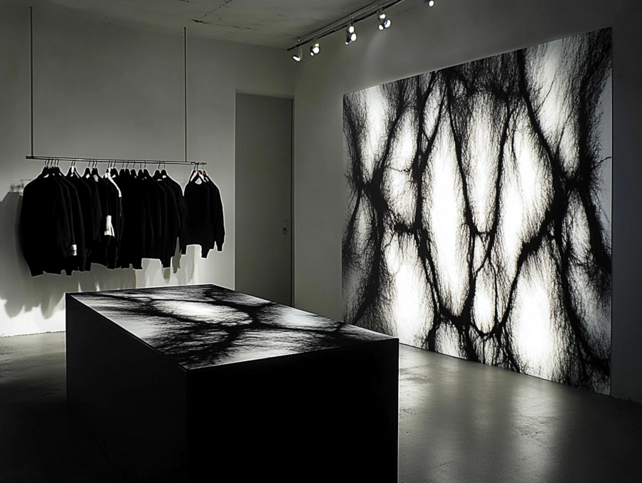 Промт для холла: «Interior of a fashion boutique with a daring atmosphere, specializing in women’s black and white tie-dye sweatshirts. The interior is decorated in stylish gray tones, emphasizing modernity and sophistication. Custom sweatshirts hang in the boutique. Large glass windows and doors are covered with chaotic fuzzy lines, adding dynamics and mystery. Boutique in daylight»