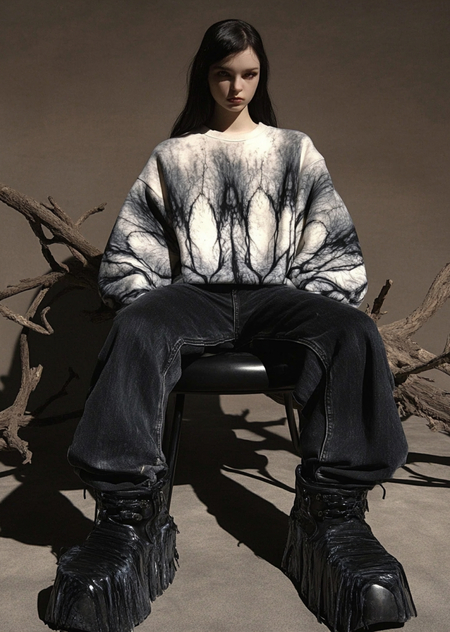 Промт: «girl poses for a fashion magazine, the cover says in large text „Choose your sweatshirt“, the poster shows a gothic girl with long black hair standing against a dramatic landscape that looks like a dead plain with dry branches and a dark sky. She is wearing wide black jeans, New Rock boots, a dark sweatshirt with tapered sleeves, worn and with frayed elements. The texture of the fabric resembles knitwear, and the tie-dye pattern is chaotic blurred lines. The atmosphere of the photo is mysterious and a little gothic, in the style of the 90s with grainy film and Y2K aesthetics, Leica M3 film camera, photography with a dreamy glow effect, glow effect, guest shot»