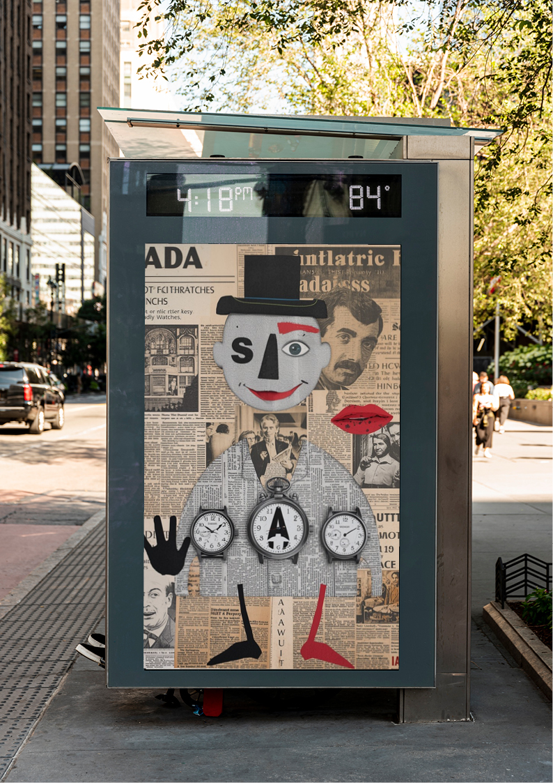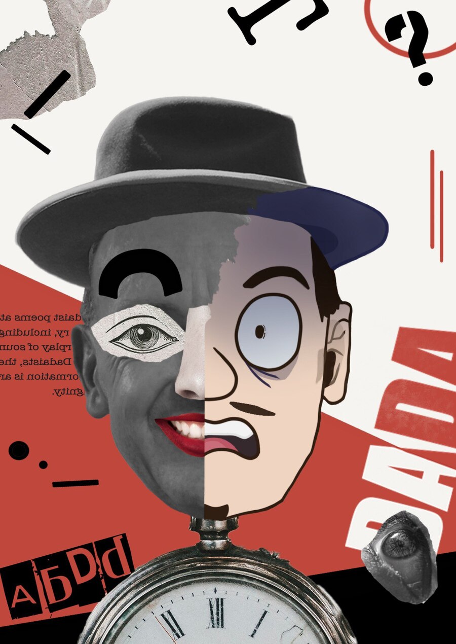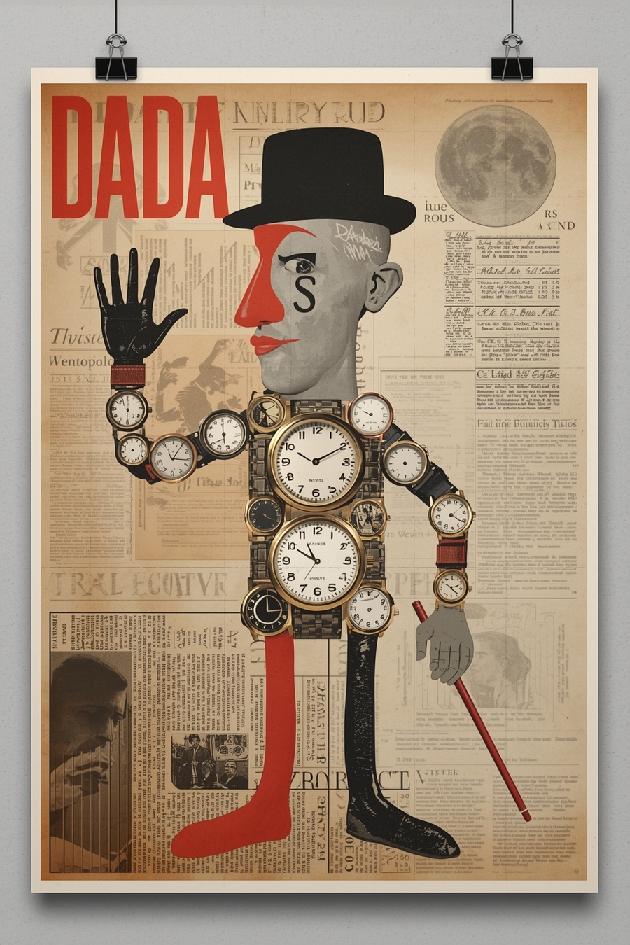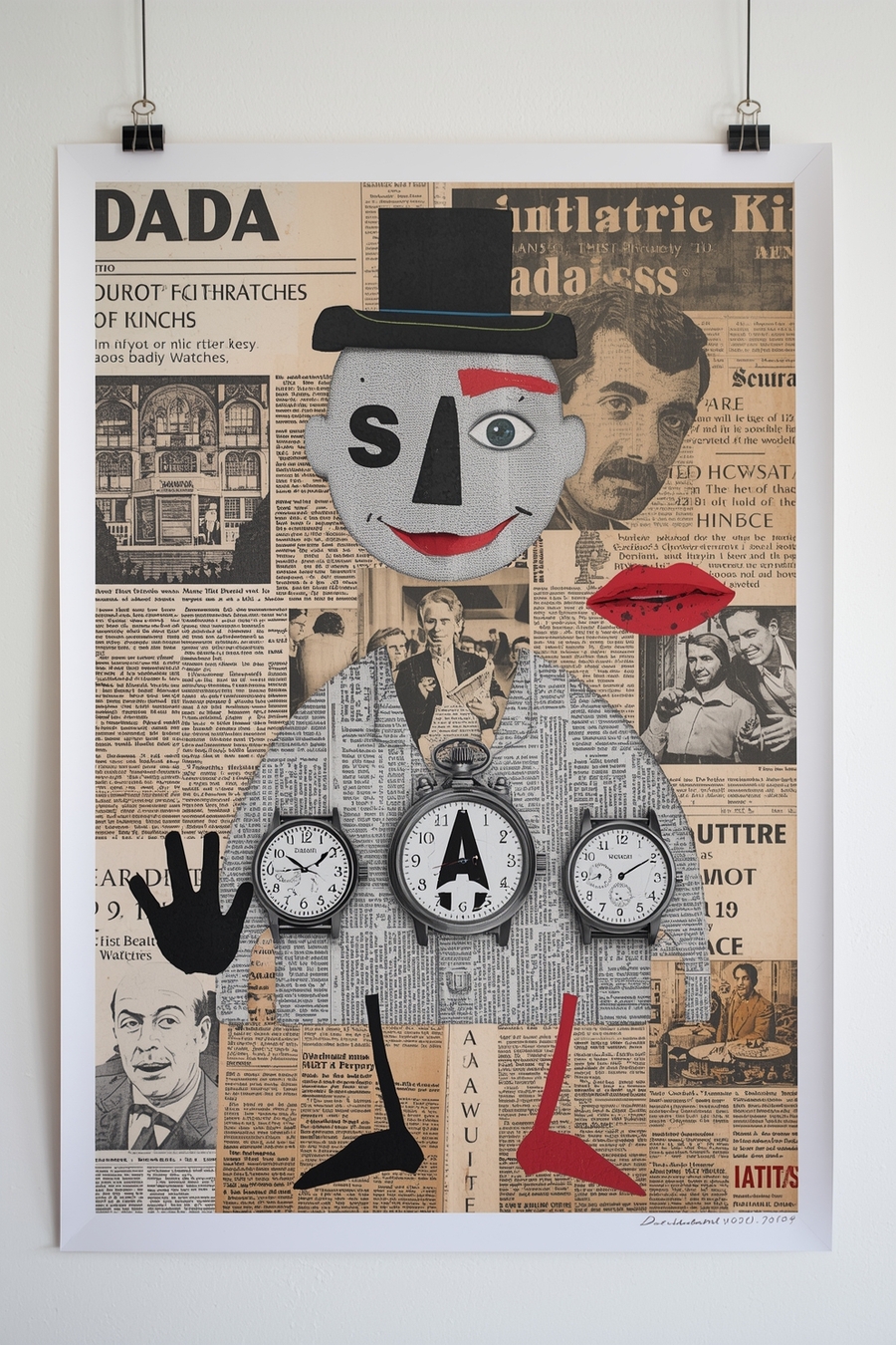 Промт для постеров: Make a poster of an artist trapped in the world of Dadaism, whose body consists only of watches, his right hand is shaped like a black letter «s», his left hand is red, his right leg is made in the form of a black printed inverted letter «I», and his left leg is shaped like a red stick. His head is gray with one human eye inherent in this gray head, and the second is painted, a human nose is cut out of some magazine, red lips in a wide smile are also cut out of a magazine, the character’s right eyebrow is red and the other is black. He wears a black hat on his head. Which should have a background related to Dadaism, and the name «DADA» should be placed above the character. The poster should be placed as if it were hanging on the wall.
