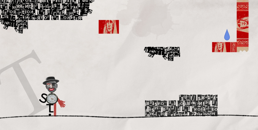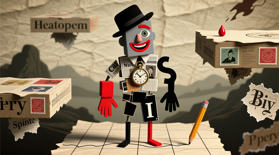 Промт для игрового экрана: A rendering of a platformer game level with an artist trapped in the world of Dadaism, whose body consists only of a watch, his right hand is shaped like a black letter «s», his left hand is red, his right foot is in the form of a black printed inverted letter «i», and his left foot is in the form of a red stick. His head is gray with one human eye inherent in this gray head, and the second is painted, a human nose is cut out of some magazine, red lips in a wide smile are also cut out of a magazine, the character’s right eyebrow is red and the other is black. He wears a black hat on his head. The artist stands on the floor, which is a pencil-drawn line in the world of Dadaism. The background is made of paper and decorated with platforms of printed type, stamp clippings and other details. There is a small painted drop on one of the platforms on the top right.