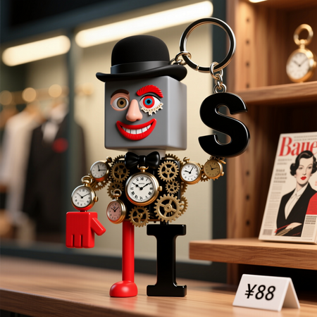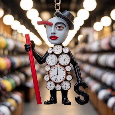 Промт для брелоков: Make a keychain in the form of an artist trapped in the world of Dadaism, whose body consists only of watches, his right hand is shaped like a black letter «s», his left hand is red, his right leg is made in the form of a black printed inverted letter «I», and his left leg is shaped like a red stick. His head is gray with one human eye inherent in this gray head, and the second is painted, a human nose is cut out of some magazine, red lips in a wide smile are also cut out of a magazine, the character’s right eyebrow is red and the other is black. He wears a black hat on his head. Also make the background so that the keychain looks like it is for sale.